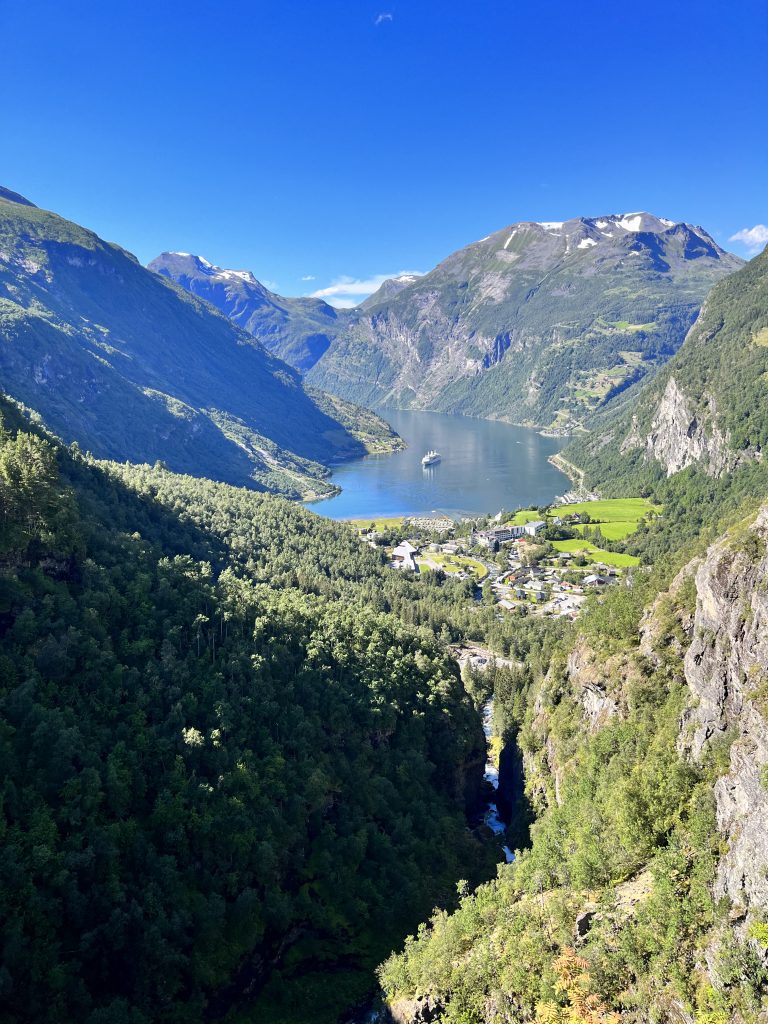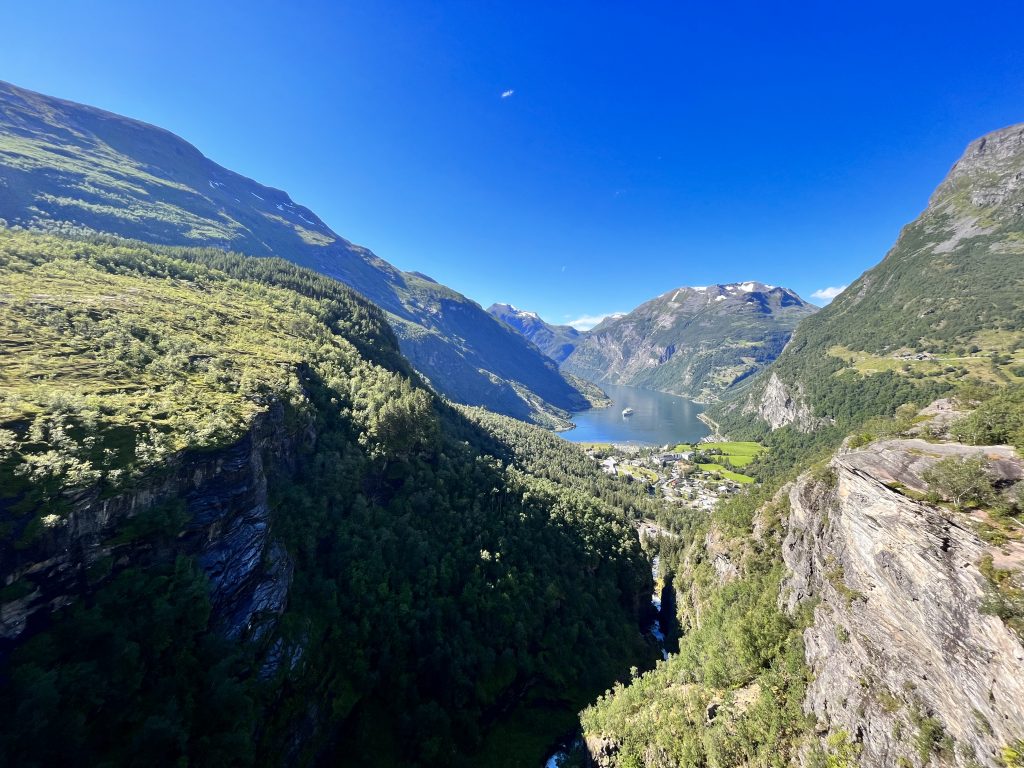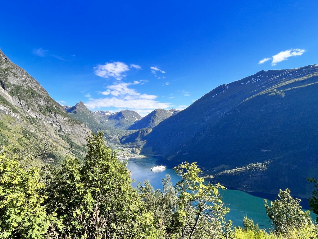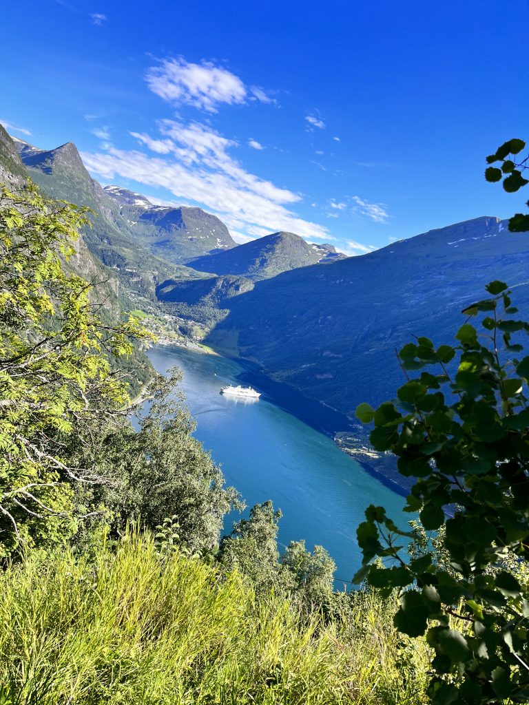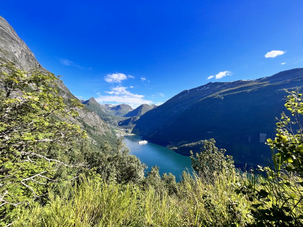 Der Geiranger Fjord und seinen Umgebung zählen zum UNESCO – Weltnaturerbe. Auf der Landschaftsroute zwischen Trollstigen und Geiranger fährt man durch eine atemberaubende Natur und über so manche Haarnadelkurve. Der Fjord erstreckt sich zwischen Hellesylt und Geiranger und ist rund 15 km lang. An den tiefsten Stellen ist er rund 260 m Tier und die mächtigen Berggipfel die den Fjord einrahmen erstrecken sich bis 1700 m in die Höhte. Bis heute ist die Region eine der meist besuchten Sehenswürdigkeiten in Norwegen und es ist keine Seltenheit, dass man Kreuzfahrtschiffe im Fjord liegen sieht. An den Hängen befinden sich verschiedenste Wanderrouten, Wasserfälle und verlassene Bauernhöfe.