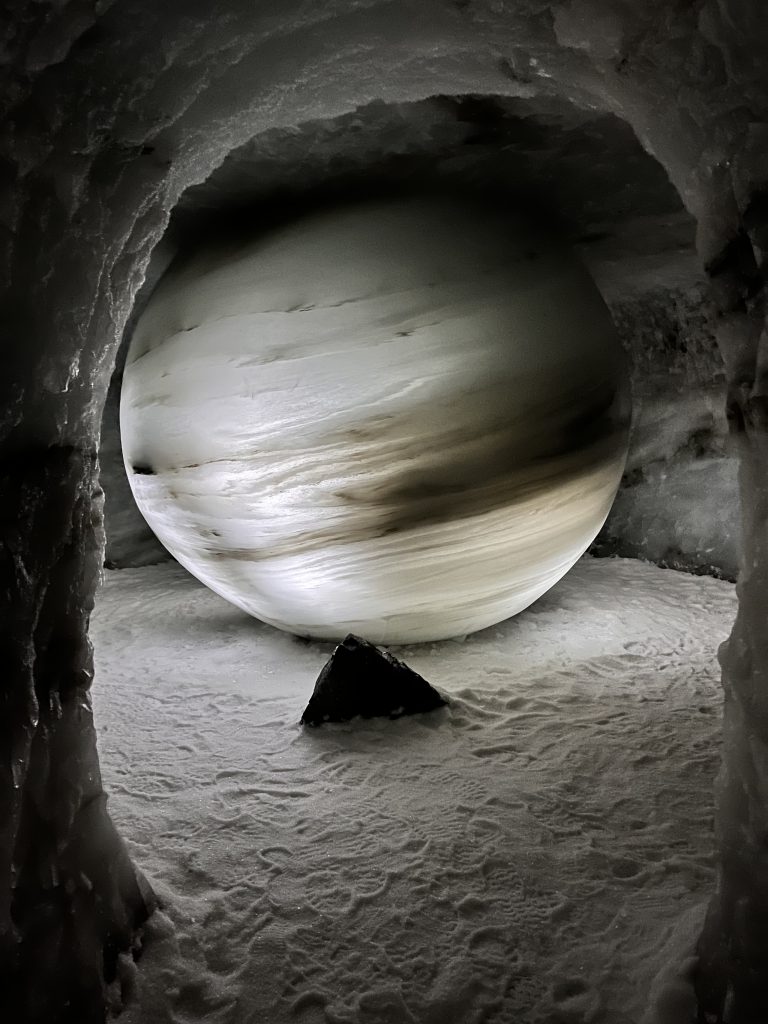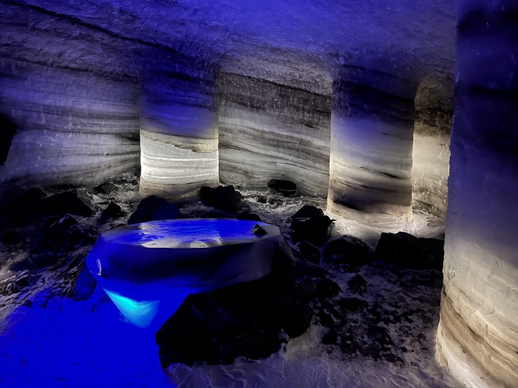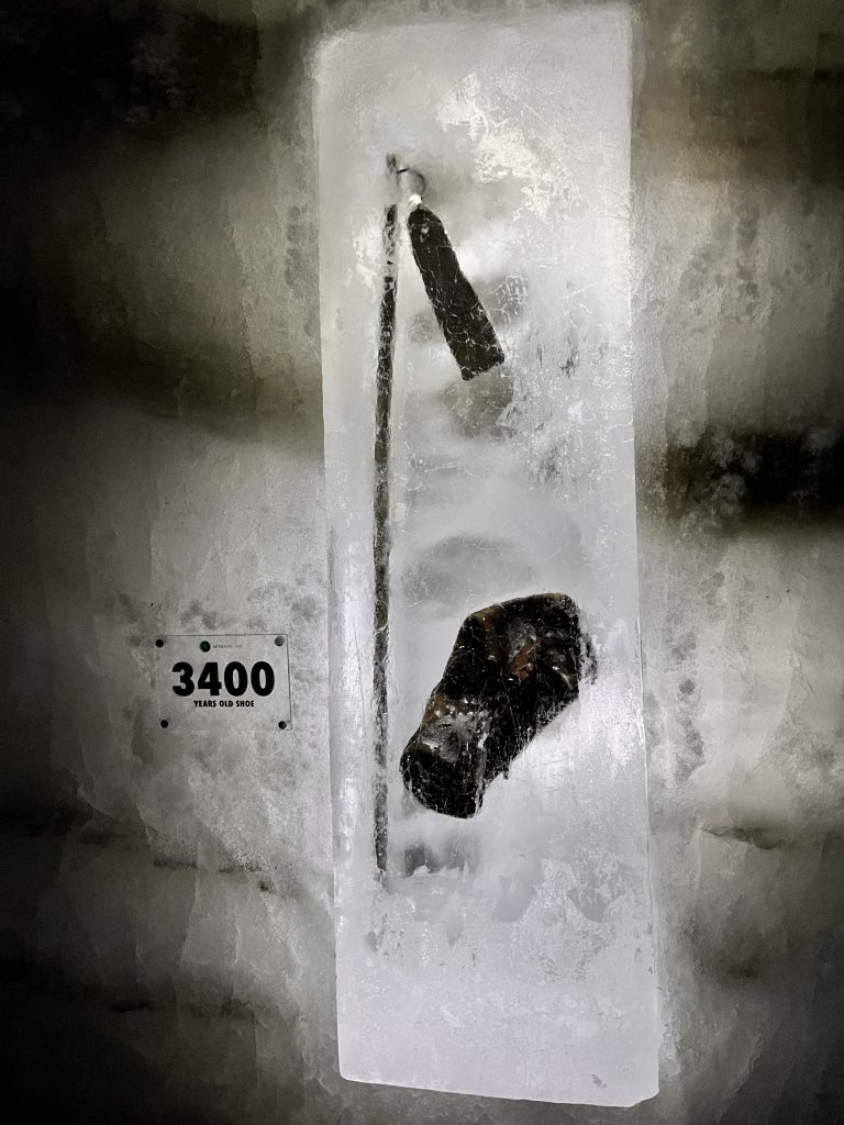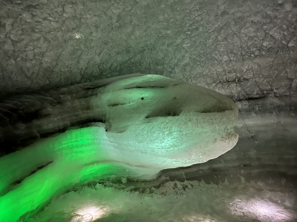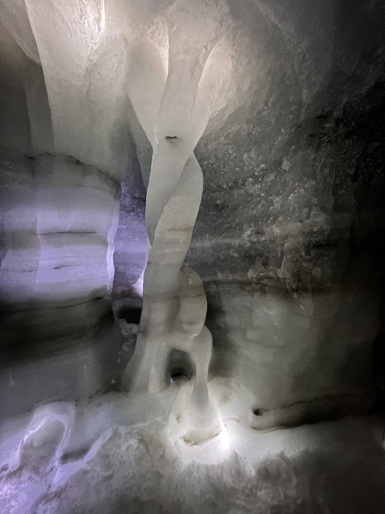 Funfact. Im Eis hat es schwarze Striemen. Das sind Ausscheidungen von Rentieren, welche im Sommer auf den Eispaces eine kühle Zuflucht gesucht haben. Bis heute sieht man diese tausende Jahre alten Ausscheidungen im Eis.