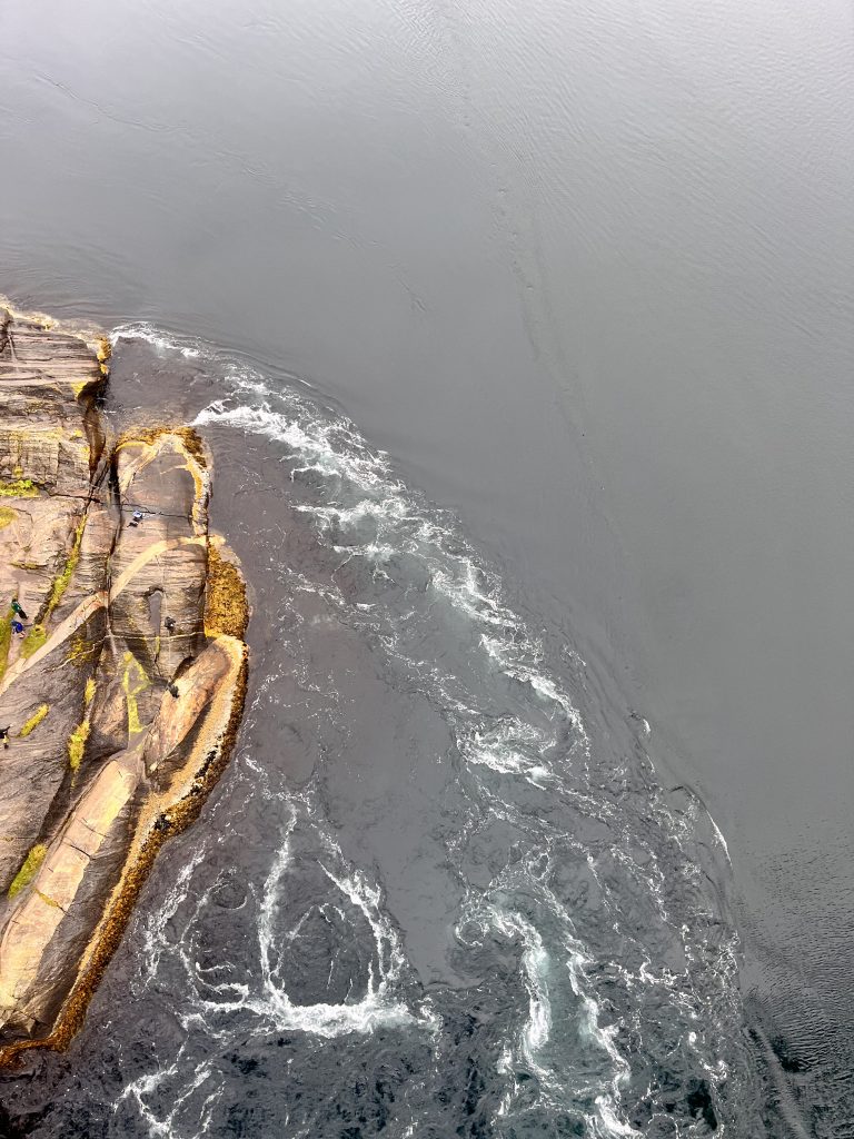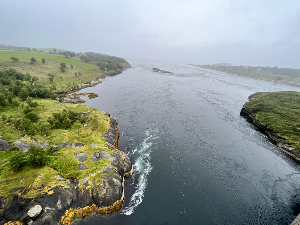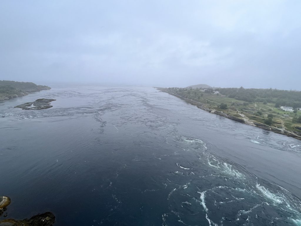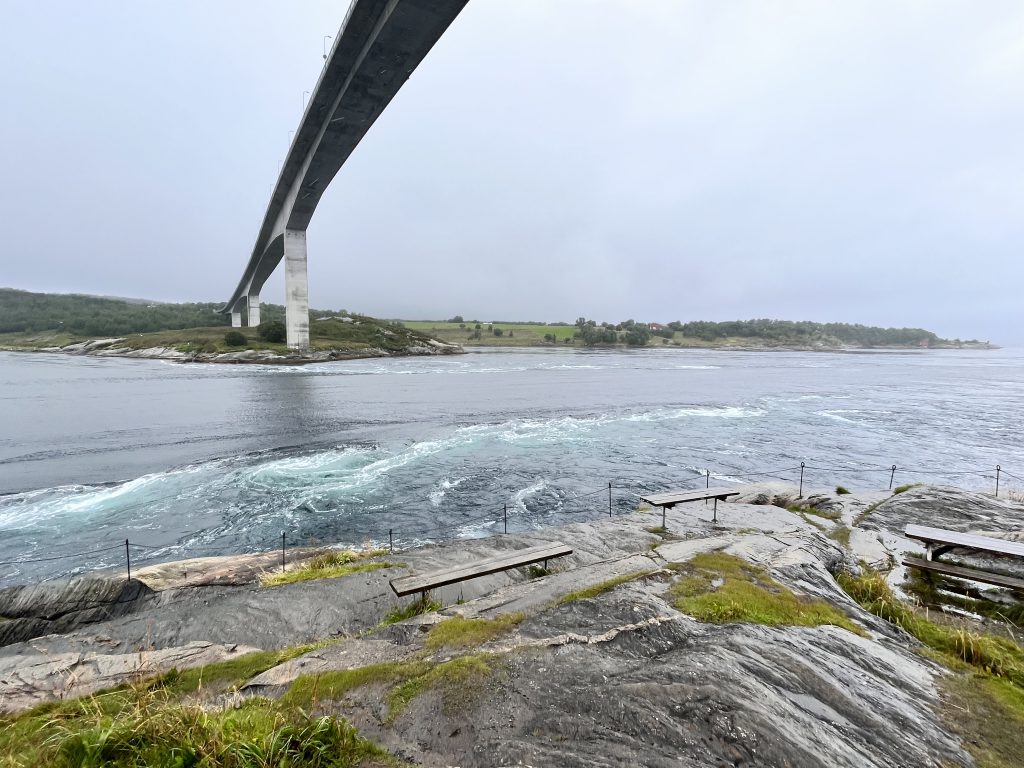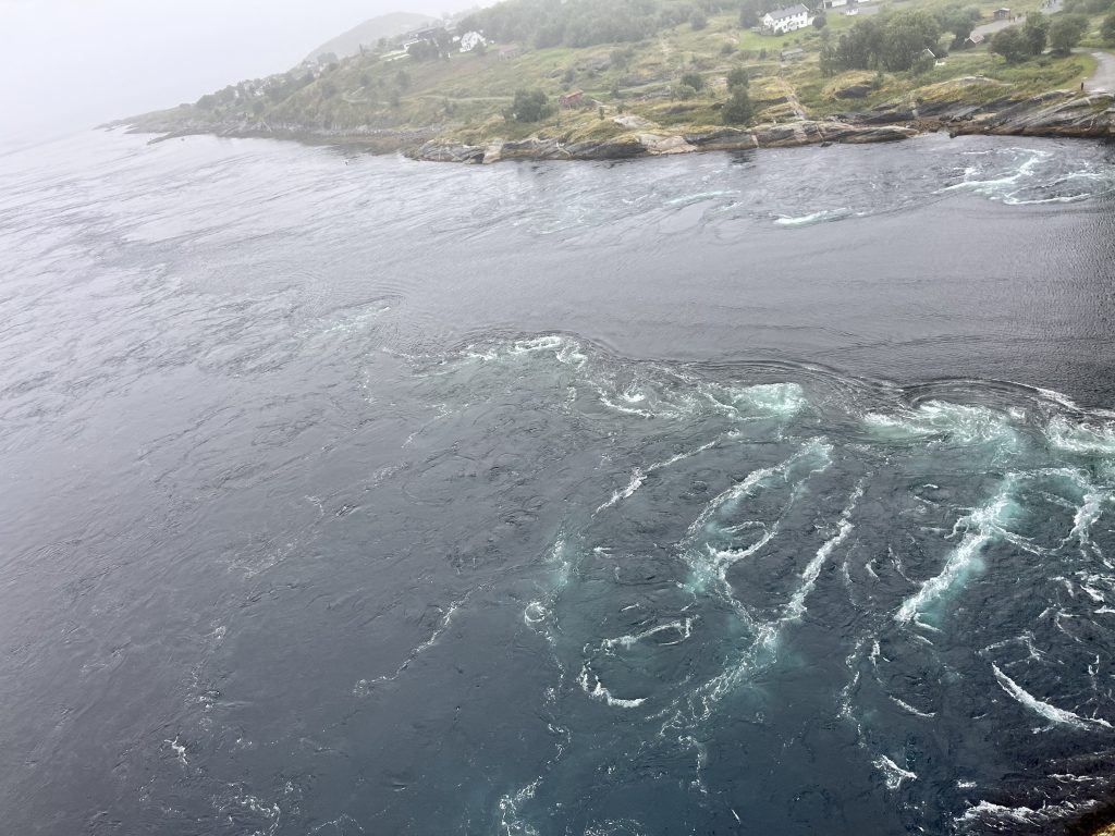 Der Saltstraumen südöstlich der Stadt Bodø ist der stärkste Gezeitenstom der Welt. Die Bedeutung des Namens lässt sich auf folgende zwei Worte zurückführen. Salten ist der Name der Region, Straumen stammt vom altnordischen Wort straumr ab und steht für Strom oder Strömung. Ein Gezeitenstrom oder auch Mahlstorm genannt entsteht, wenn Wasser zwischen zwei Fjorden hin und her strömt. Fast 400 Milionen m³ Wasser zwängen sich im Laufe von 6 Stunden durch die 3 Kilometer lange und 150 m breite Meeresenge zwischen dem Skjerstad- und dem Saltenfjord. So gross ist der Pegelunterschied zwischen Ebbe und Flut. Der Strom erreicht eine Geschwindigkeit von bis zu 20 Knoten (ca. 40 km/h). Die Strudel in diesem natürlichen Whirlpool haben einen Durchmesser von bis zu 10 m. Viermal am Tag, etwa alle 6 Stunden, ändert der Strom den Gezeiten folgend seine Richtung und liegt für eine kurze Zeit still, bevor die Wassermassen mit voller Kraft in die andere Richtung strömen. Dieser Richtungswechsel nennt man auch Tidenumkehr. Der Saltstraumen ist nicht jeden Tag und zu jeder Tageszeit glich stark. Hier spielen die Mondphasen,Tag- und Nachtgleiche, Sonnenwenden, sowie Wind- und Luftdruck eine Rolle. Das Wasser führt auch Nahrung für grosse Fischschwärme mit sich. Diese locken Meeresvögel und Angler an.