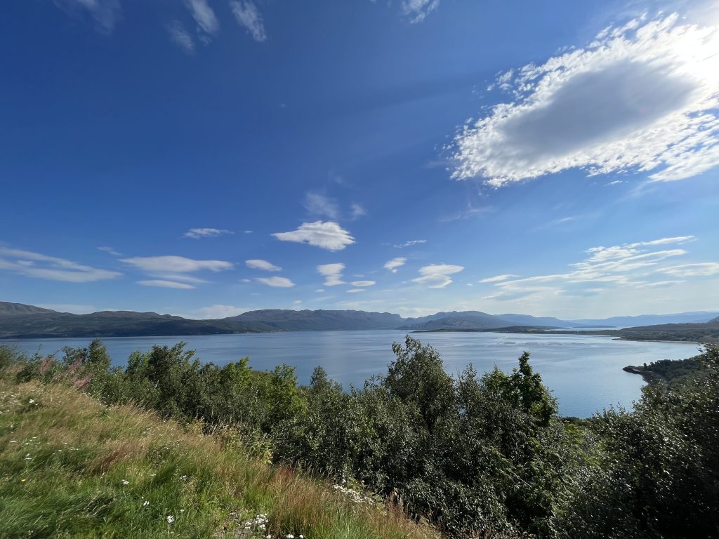 Wieder auf der richtigen Seit angekommen machten wir uns auf den Rückweg. Zuvor legten wir noch bei einem Lebensmittelgeschäft einen Stop ein und fuhren danach weiter in Richtung Norden. Irgendwo unterwegs machten wir einen Stop auf einer Raststätte. Sie war nicht so, wie wir Raststätten kennen. Direkt am Fjord gelegen, mit einem Gigampfi und einem Strand. Daher beschlossen wir, dass wir Dinah hier etwas Freilauf geben können und essen zu Abend. Natürlich darf die Runde „gigampfe“ nicht fehlen. Auch Marco versucht sich daran, steigt aber alsbald wieder ab.