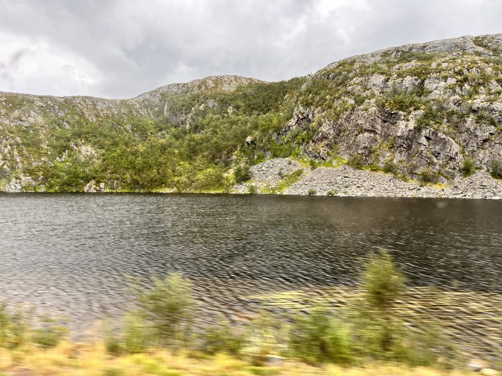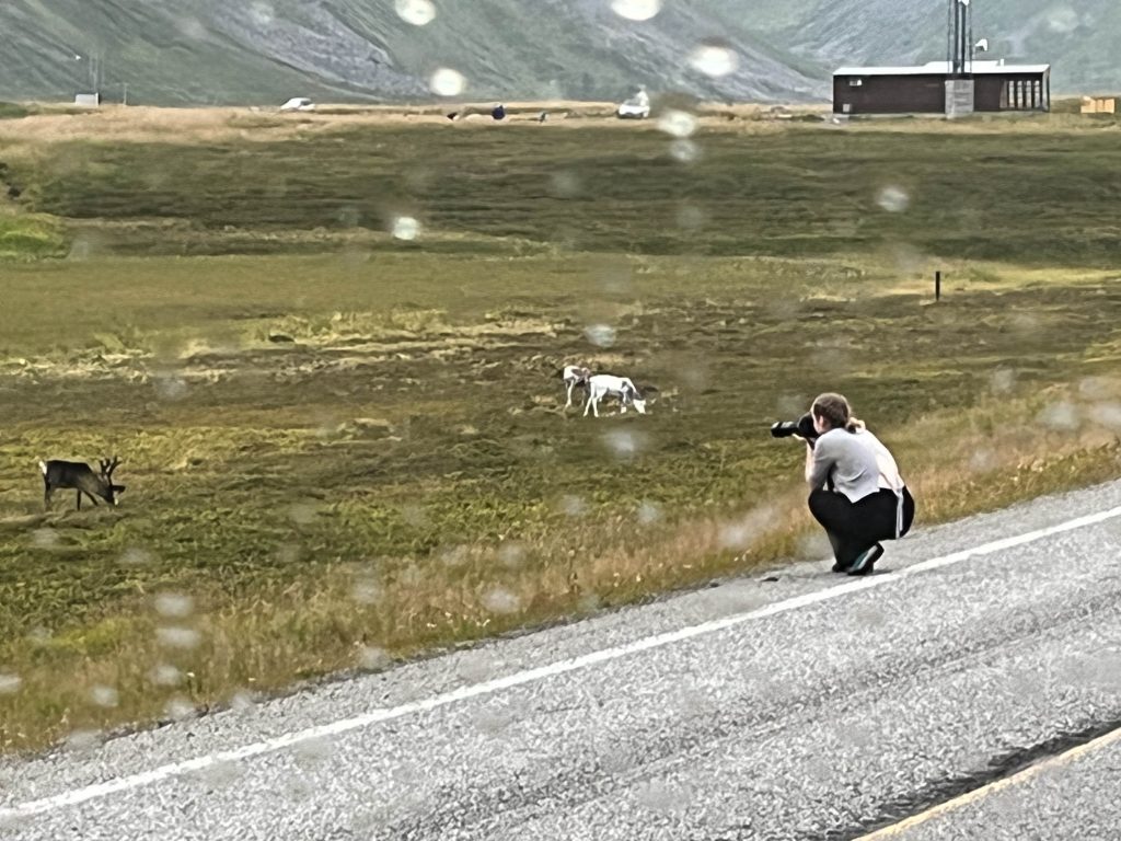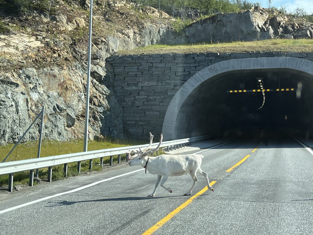 Nun geht es aber endlich weiter. Die Tunnels, welche uns unter den Fjorden durchführen erinnern etwas an Zwergenhöhlen und -Tunnelsysteme. Zuerst geht es steil nach unten und kaum da angekommen geht es auch schon wieder nach oben. Als wir aus einem dieser Tunnel fahren, sehen wir auf der linken Strassenseite plötzlich eine Herde Rentiere. Wieso bin ich vorher so weit gelaufen, wenn ich sie jetzt direkt am Strassenrand finde? Das frage ich mich noch einige Male auf dem Weg. Denn ab jetzt sind sie ständige Begleiter im Landschaftsbild.