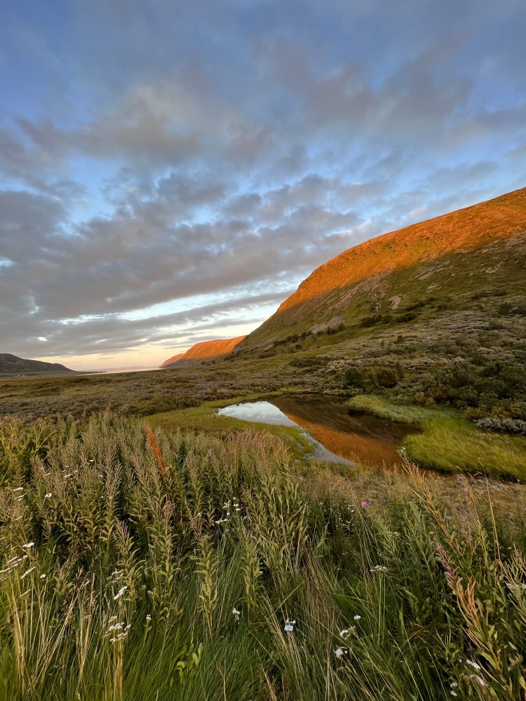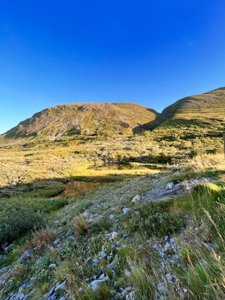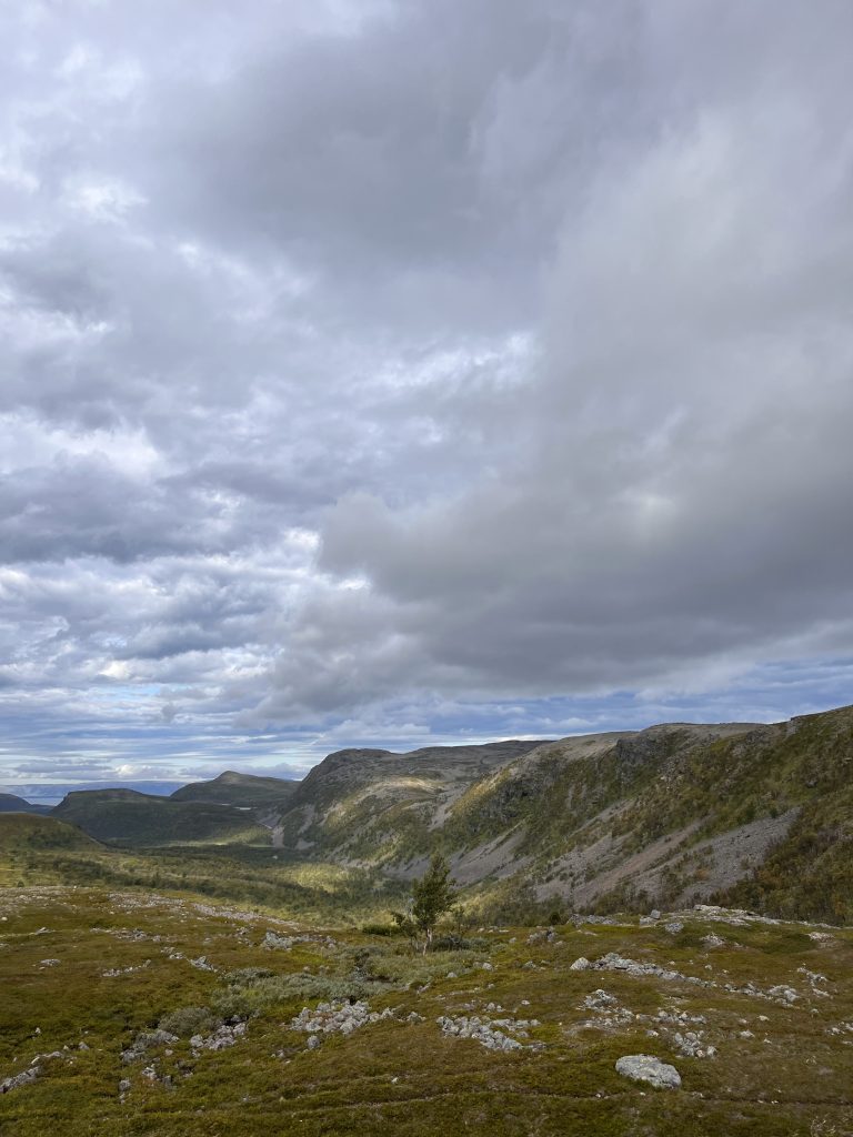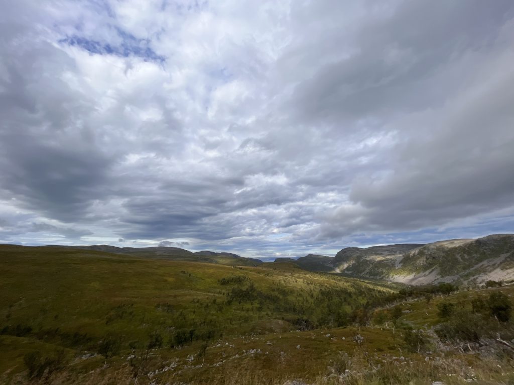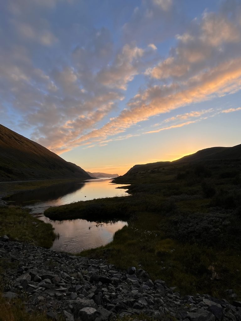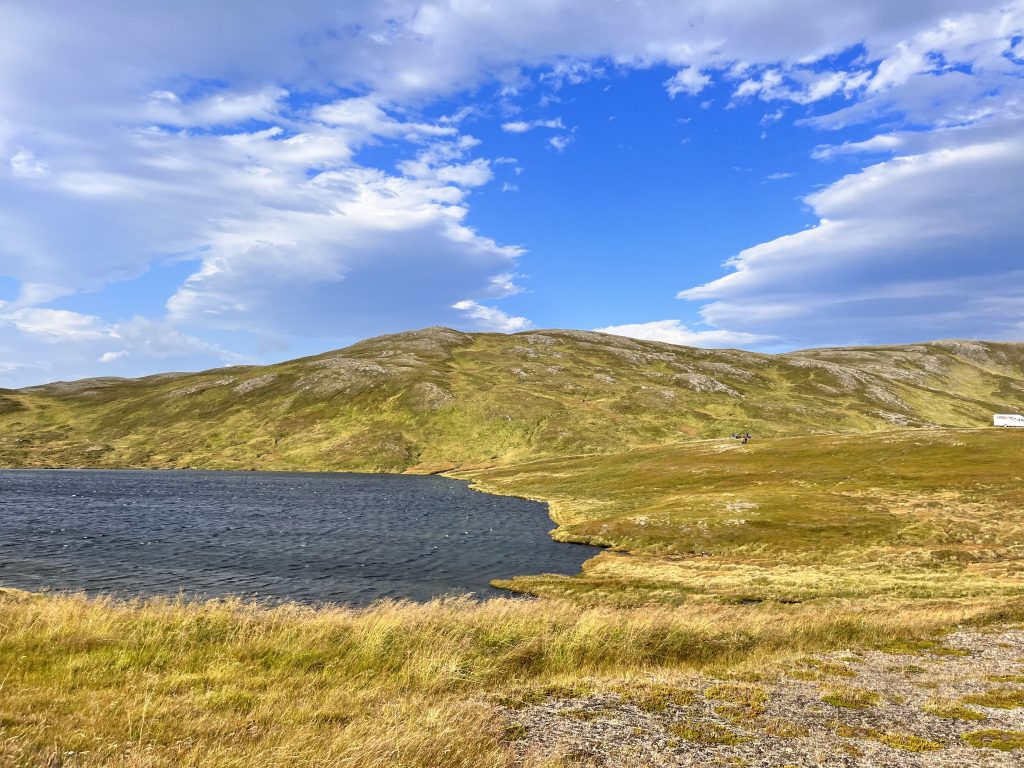 Irgendwann beschliessen wir, dass es Zeit für eine Pause ist und wir mal wieder Baden sollten. So suchen wir uns eine Platz mit einem Bach. Eins, zwei, drei und rein ins kalte Wasser. Danach fühlen wir uns aber wieder erfrischt und könnten die Reise fortsetzten. Da wir aber zuvor eine Gruppe Rentiere gesehen haben, mache ich mich mit dir Kamera auf den Weg um sie zu suchen. Ich wandere auf dem Plateau entlang und finde keine. Als ich mich schon auf den Rückweg machen will, sehe ich plötzlich eines. Kurze Zeit später sehe ich noch eine Herde mit fünf Tieren, welche aber sehr weit weg ist. So mache ich mich auf den Weg zurück. Marco hat in der Zwischenzeit mit Campern ein Gespräch gestartet und unsere Weiterfahrt verzögert sich nochmals etwas.