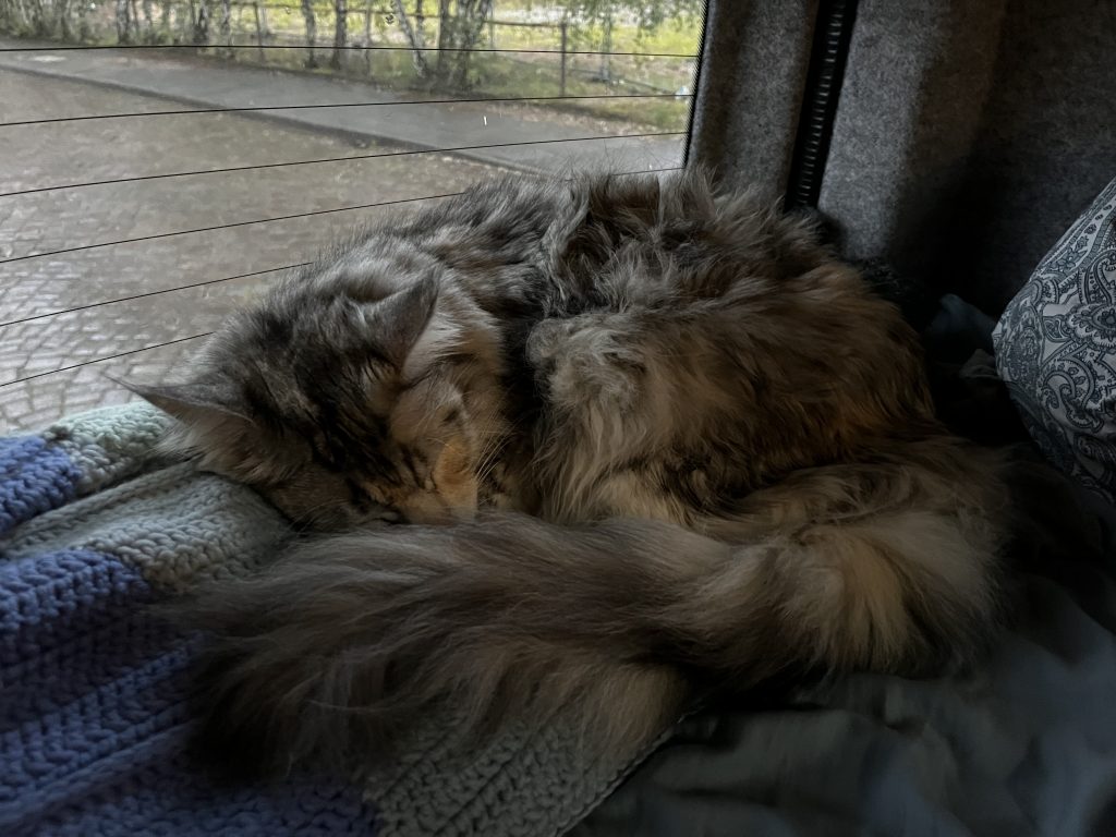 Trotz kleineren Schauern, schafften wir es, dass unsere Wäsche trocken wurde. So packten wir alles wieder ein und machten uns am Mittwoch mit leeren bzw. vollen Tanks wieder auf den Weg. Das nächste Ziel war nicht all zu weit entfernt. Vorher setzten wir uns aber in ein Kaffe und Marco arbeitete.