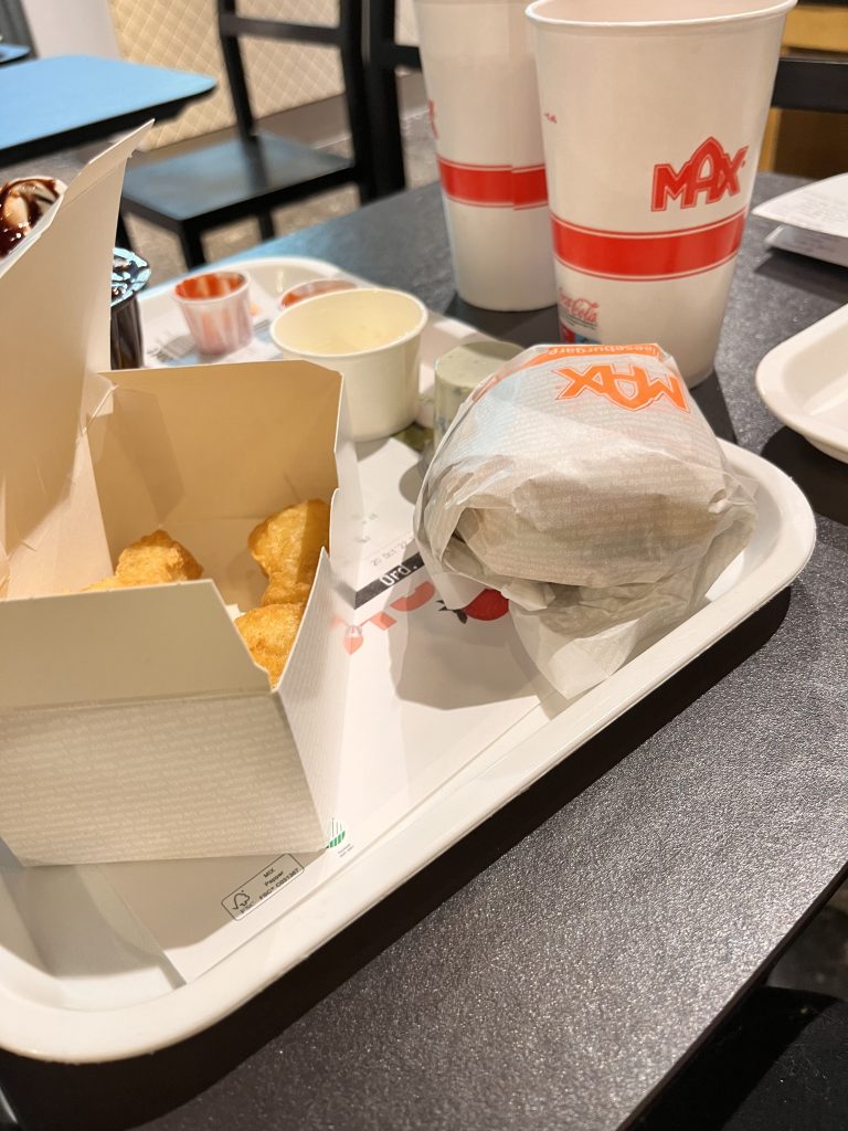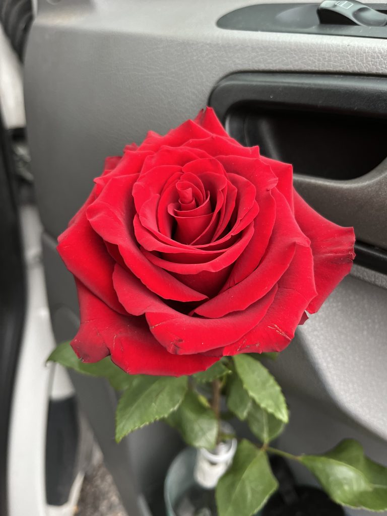 Danach machen wir uns wieder auf den Weg zu einem Platz an dem wir übernachten wollen. Da angekommen gefällt er uns aber nicht und wir beschliessen noch weiter zu fahren. In der Zwischenzeit ist es schon dunkel geworden, obwohl es erst kurz nach 18.00 Uhr ist. Wir legen nochmals eine Stop ein um etwas zu suchen, werden jedoch nicht fündig. Da es in der nähe noch eine Burgerladen hat, beschliessen wir heute auswärts Burger zu essen. Marco ist noch kurz weg und kommt mit einer Rose für mich zurück. Wie schön. Danach setzten wir uns ins Restaurant und essen unser Abendessen bevor wir nochmals weiterfahren, bis wir einen passenden Platz gefunden haben.