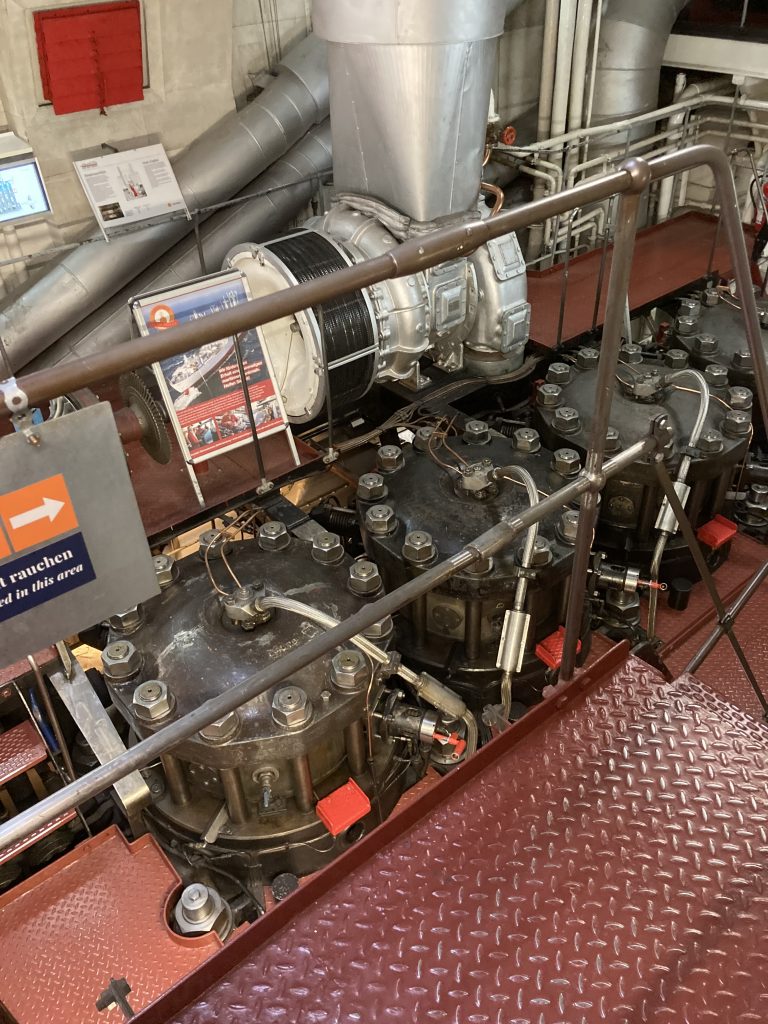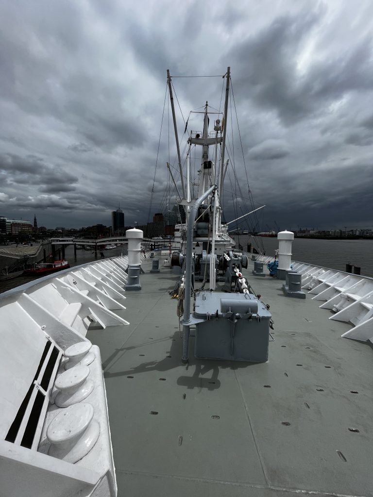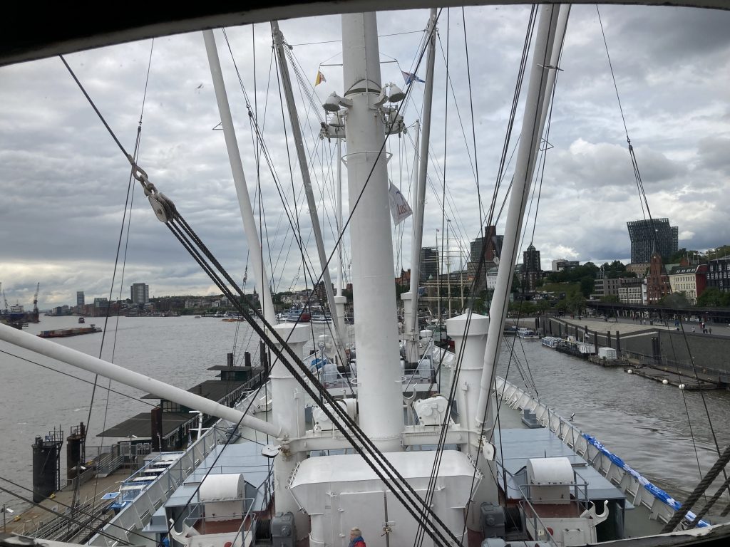 Jedoch wollte ich direkt nach dem Aufstehen duschen gehen. Leider gab es kein warm Wasser. Da eine Sicherung beim Boiler defekt war, musste zuerst ein Handwerker kommen um es zu reparieren. Daher vereinbarten wir mit dem Campingplatz, dass wir Knuschel am Tag noch stehen lassen können um am Abend zu Duschen und abzuwaschen. Da nicht viel los war an diesem Montag war es möglich obwohl wir heute abreisen. So machten wir uns wieder auf den Weg in die Innenstadt. Diesmal nicht zu fuss, sondern mit den E-Trottinett. Das macht riesigen Spass. Die knapp 3,5 km waren ein Klacks. Unser Ziel war die Cap San Diego. Ein Museumsschiff, welches im Hamburger Hafen liegt. Sie ist das grösste noch fahrtüchtige Museumsschiff der Welt. Ihre Karriere war leider nicht all zu lang, da sie noch für Stückguttransporte gebaut wurde und schon bald darauf auf Containerfracht umgestellt wurde.