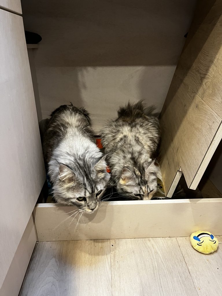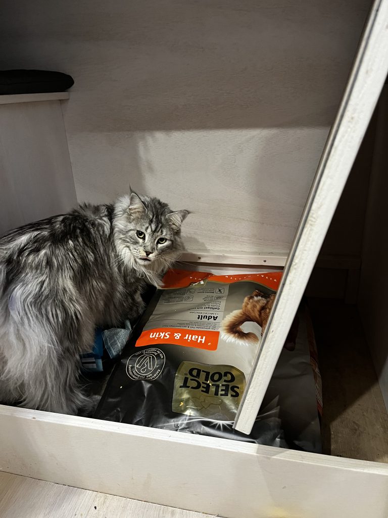 In der Zwischenzeit hatte der Camping wieder warm Wasser, sodass wir abwaschen und duschen konnten. Wir putzen noch Kuschel und füllten das Katzenfutter auf. So kam es, dass Dylan und Dinah das Futterlager entdeckten. Sie stellten fest, dass sie in nächster Zeit nicht hungern müssen und waren zufrieden 😉