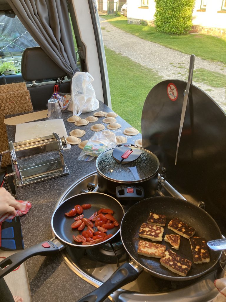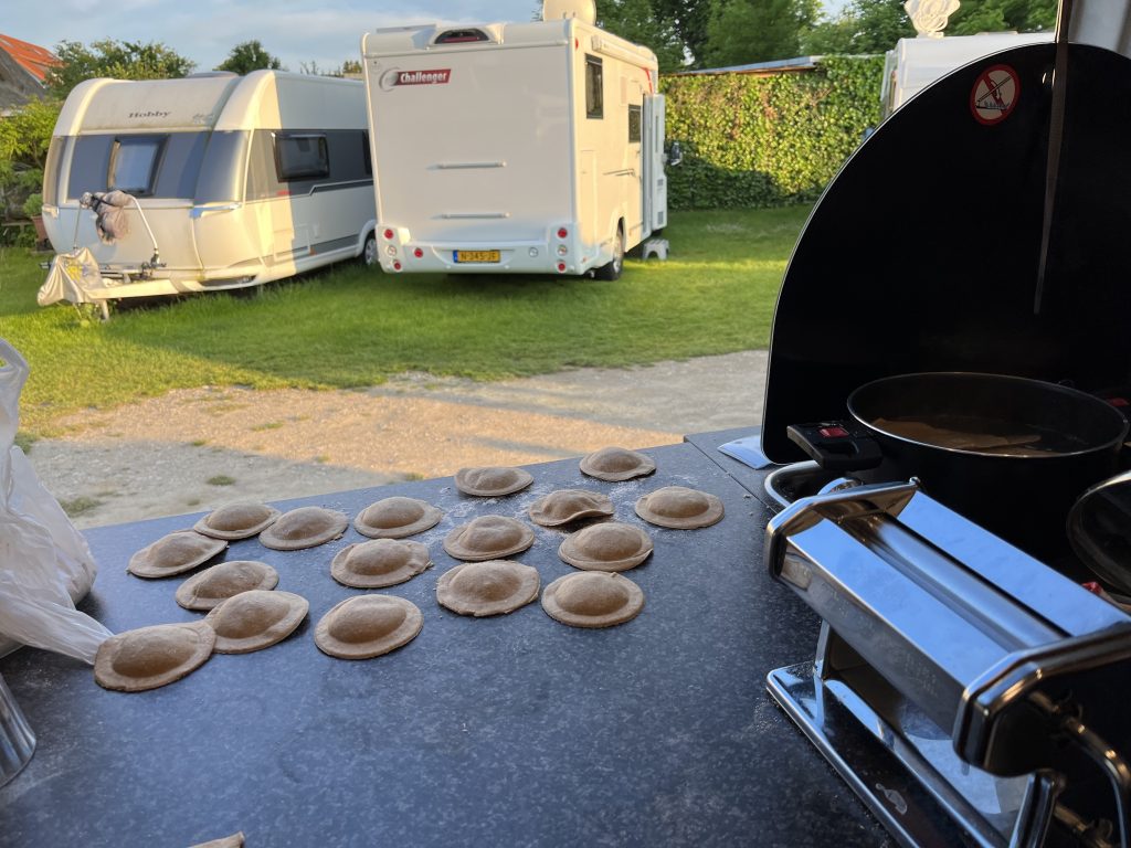 Beim Abendessen gaben wir uns grosse Mühe. Weil wir sind, wie wir sind und beide Pasta über alles lieben, haben wir unsere kleine Pastamaschine mitgenommen. Also machten wir Zuchetti-Frischkäseravioli. Superlecker.