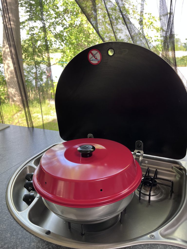 Der Camping liegt direkt am See (es ist ein geschlossener Nebenarm der Oder) und von unserem Platz aus musste man zweimal umfallen bis man im Wasser war. Daher und weil ich am nächsten Tag noch waschen wollte, beschlossen wir für zwei Nächte zu bleiben. An dem Abend beschloss ich, dass es nun endlich an der Zeit ist unseren Omnia auszuprobieren. Daher gab es Dampfnudel mit Vanillesauce. Ich war positiv überrascht und es klappte alles einwandfrei.