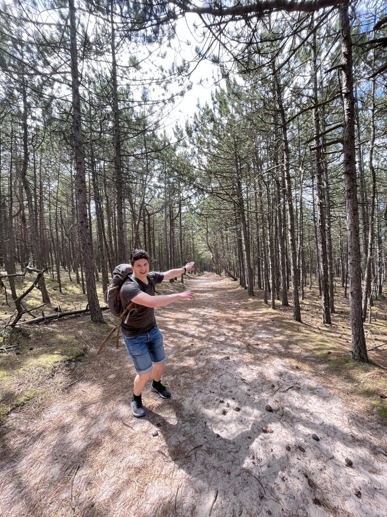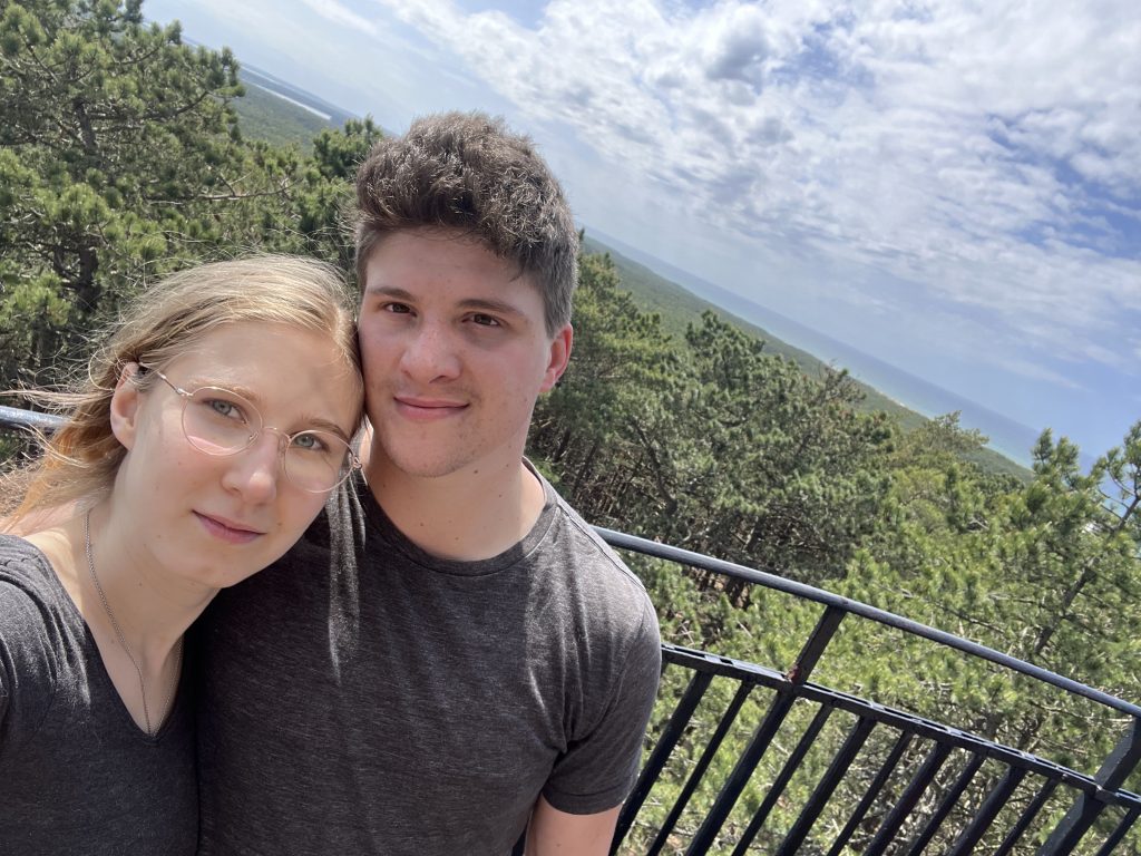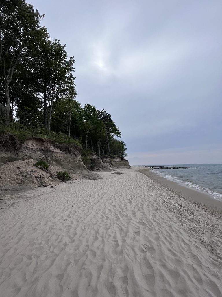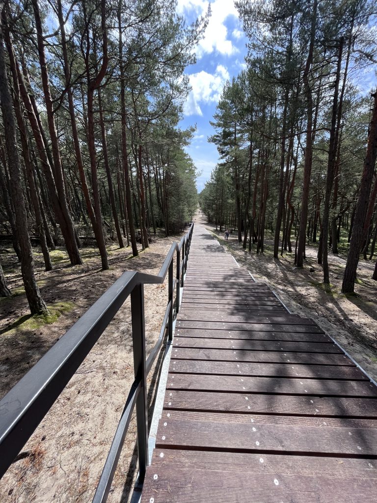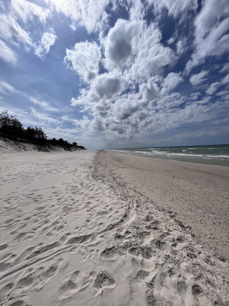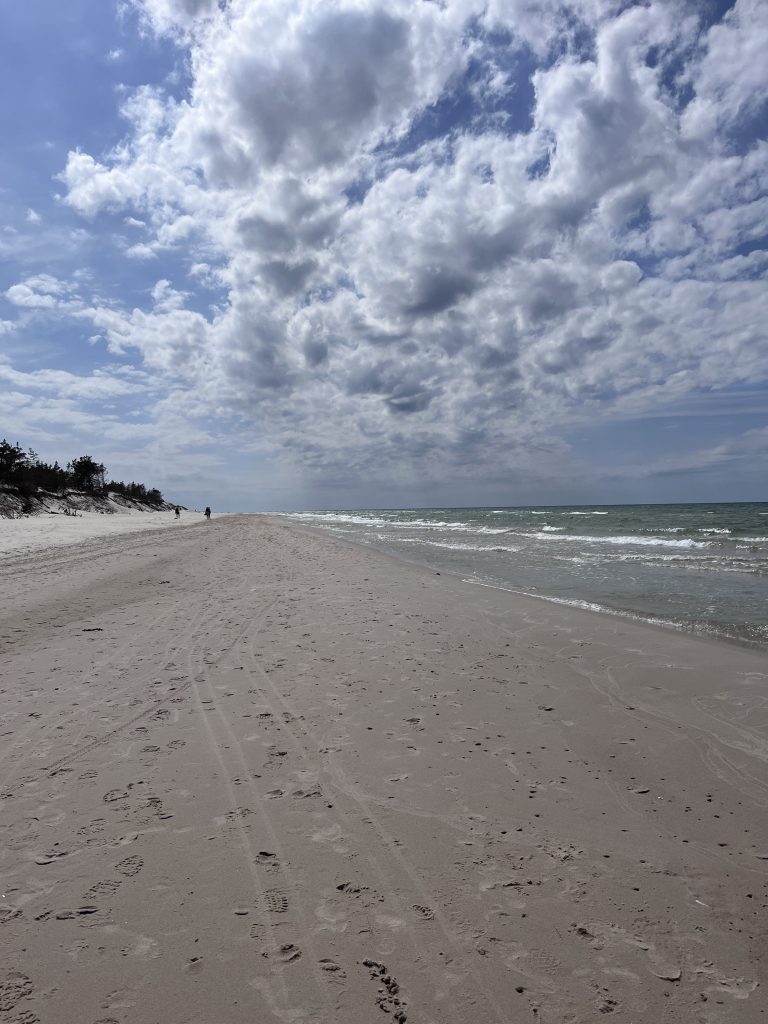 Am Sonntag erkundeten wir ein Stück der Küstenlinie des Slowinski Nationalparks. Zuerst liefen wir zum Leuchtturm, auf welchen wir auch hinaufgingen, nach langer Wartezeit. Danach wanderten wir zur Küste runter und liefen am Meer entlang. Das Wetter war wunderschön, jedoch immer noch ziemlich kühl und windig. Daher wurde aus meinem Plan zu baden leider nichts. Die Umgebung ist einfach atemberaubend schöne und gemütlich. Obwohl es einige Einheimische hat die einen Tagesausflug machen, ist es sehr ruhig. Als wir zurück waren, konnten wir Dylan und Dinah endlich überreden mit uns einen Ausflug im Rucksack zu machen. Nicht weit, aber wenigstens kamen sie mit. Dinah hatte dann auch noch beschlossen, dass sie selber laufen will und so waren wir sehr gemütlich unterwegs.