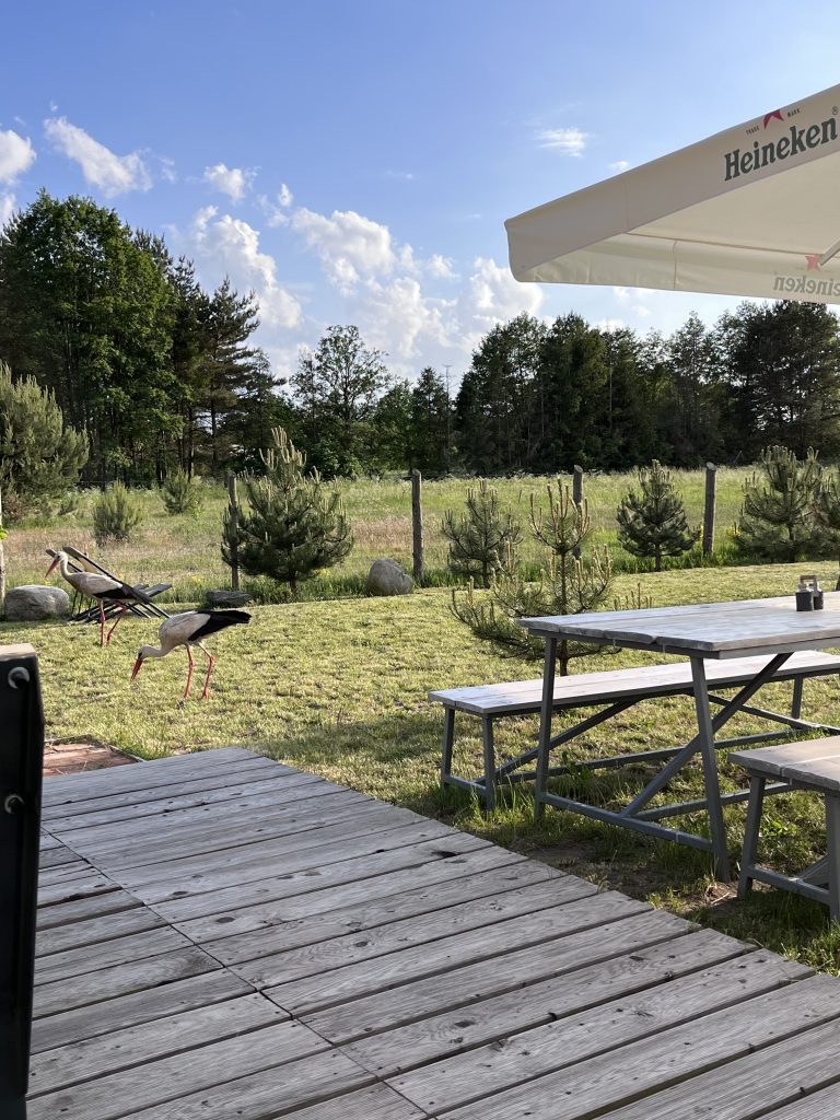 Wir beschlossen in ein das kleine polnische Restaurant am Anfang der Strasse zu gehen und haben da typische Spezialitäten wie Pierogi (gefüllte Teigtaschen), Mizeria (Gurkensalat mit Dill, Sauerrahm und Zitronensaft) oder Golabki (Gefüllte Kohlblätter mit Hackfleisch, Reis, Pillzen und Zwiebeln) gegessen. Dabei leisteten uns zwei Störche Gesellschaft. Störche sieht man in Polen an sehr vielen Orten, denn rund 25% der Weltpopulation der Weissstörche brüten in Polen. Nach dem Essen machten wir uns mit vollen Bäuchen und zufrieden zurück zum Campingplatz.