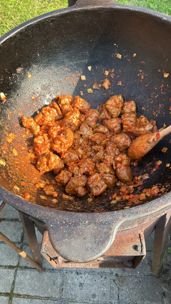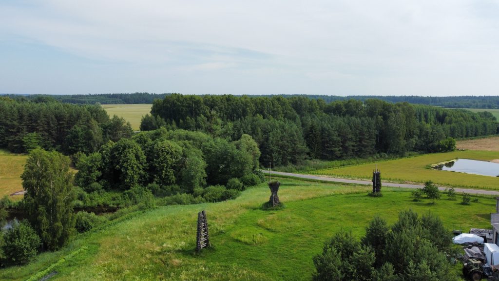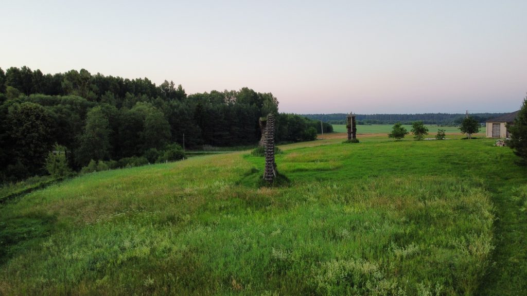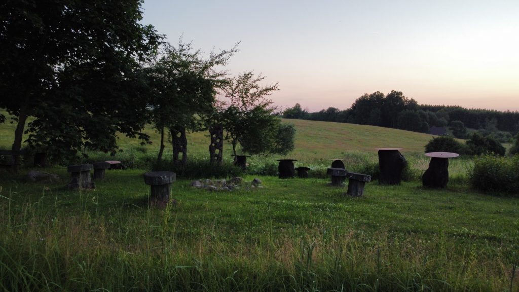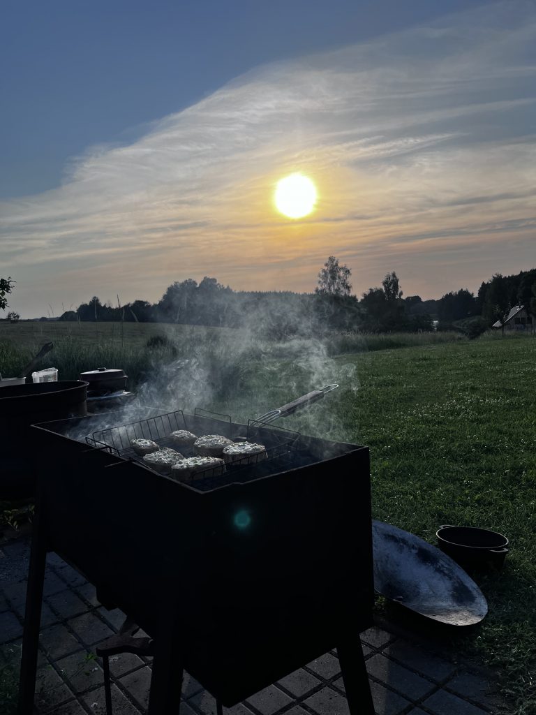 Marco macht sich direkt auf um das Feuer zu entfachen auf welchem wir unser Gulasch kochen wollen. Und so fangen wir an zu brutzeln und zu kochen. Am Nachmittag habe ich noch einen Brotteig vorbereitet, welchen wir nun in einem Topf auf der Glut backen. Etwas zu lange ….. Upps. Daher disponieren wir kurzfristig um und machen aus dem Brot kleine Knoblauchbrotschnitten, sodass wir die etwas zu dunklen Teile abschneiden können. Ein weiteres Experiment ist unser Bananenbrot, welches wir im Omnia über dem Feuer gebacken haben. Das funktionierte wiederum super und auch unser Gulasch ist super lecker geworden. Noch etwas frischen Salat aus dem Garten von Ruta und so setzen wir uns draussen im Pavillon hin und essen gemütlich zu Abend. Die Gespräche, auf Deutsch mit Ruta und auf Englisch mit Česlovo, laufen mal ernster und mal etwas lockerer vor sich hin. Es ist sehr spannend mit ihnen zu diskutieren wo die Unterschiede zwischen unseren Ländern, Kultur, Wirtschaft und Jugend sind. So vergeht der Abend im Nu. Herzlichen Dank für die Einführung in die litauische Biergeschichte. Nach dem Essen fragt Česlovo uns, ob er uns seine Kunst zeigen kann. Wir stimmen zu und bekommen so eine Einführung in seine Werke und die spannende Erklärung was hinter verschiedenen Stücken steckt. Er macht auch Musik und spielt das Saxophon. So kommen wir in den Geschmack eines kleinen Privatkonzert. Nur für uns zwei. Und die Aufforderung zu tanzen, was wir beide nicht sehr gut beherrschen, steht im Raum. So bewegen wir uns gemeinsam etwas ungelenk in dem Raum, der von tanzenden Lichtern und dem vollen Klang der Musik ausgefüllt wird. Es macht unglaublich viel Spass und ist eine sehr intensive Erfahrung, welche sicherlich einmalig ist und uns noch lange in Erinnerung bleiben wird. Und so neigt sich schon wieder ein Tag dem Ende zu. Für heute sind wir gesättigt von den vielen verschiedenen Eindrücken und Erlebnissen.