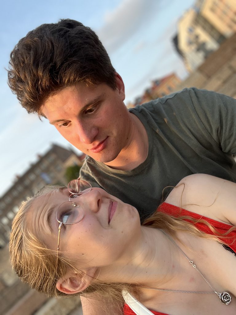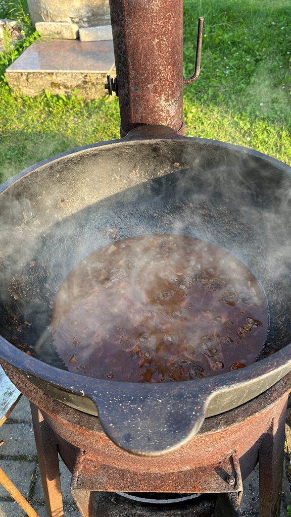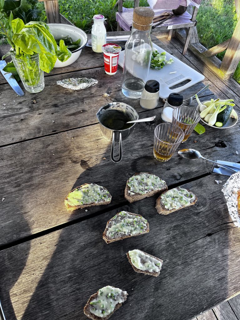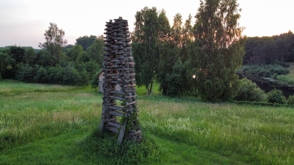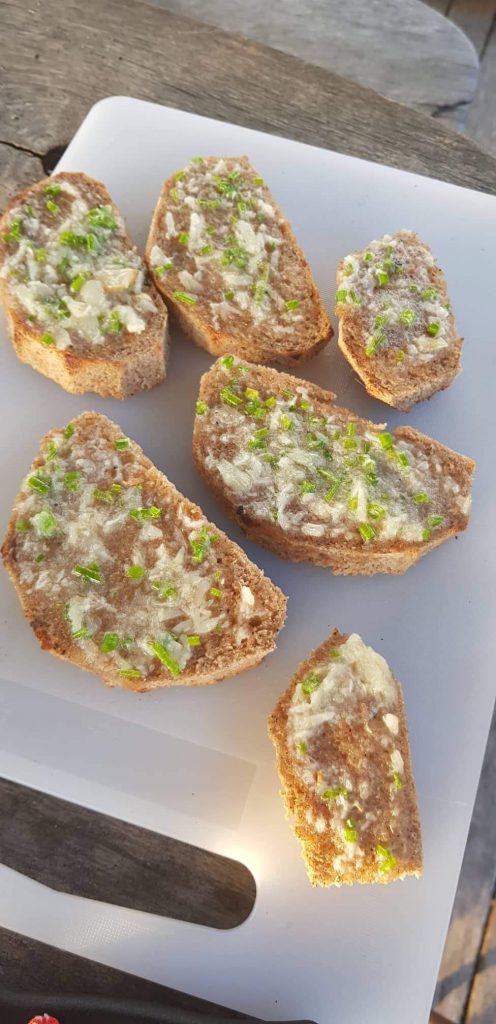 Marco macht sich direkt auf um das Feuer zu entfachen auf welchem wir unser Gulasch kochen wollen. Und so fangen wir an zu brutzeln und zu kochen. Am Nachmittag habe ich noch einen Brotteig vorbereitet, welchen wir nun in einem Topf auf der Glut backen. Etwas zu lange ….. Upps. Daher disponieren wir kurzfristig um und machen aus dem Brot kleine Knoblauchbrotschnitten, sodass wir die etwas zu dunklen Teile abschneiden können. Ein weiteres Experiment ist unser Bananenbrot, welches wir im Omnia über dem Feuer gebacken haben. Das funktionierte wiederum super und auch unser Gulasch ist super lecker geworden. Noch etwas frischen Salat aus dem Garten von Ruta und so setzen wir uns draussen im Pavillon hin und essen gemütlich zu Abend. Die Gespräche, auf Deutsch mit Ruta und auf Englisch mit Česlovo, laufen mal ernster und mal etwas lockerer vor sich hin. Es ist sehr spannend mit ihnen zu diskutieren wo die Unterschiede zwischen unseren Ländern, Kultur, Wirtschaft und Jugend sind. So vergeht der Abend im Nu. Herzlichen Dank für die Einführung in die litauische Biergeschichte. Nach dem Essen fragt Česlovo uns, ob er uns seine Kunst zeigen kann. Wir stimmen zu und bekommen so eine Einführung in seine Werke und die spannende Erklärung was hinter verschiedenen Stücken steckt. Er macht auch Musik und spielt das Saxophon. So kommen wir in den Geschmack eines kleinen Privatkonzert. Nur für uns zwei. Und die Aufforderung zu tanzen, was wir beide nicht sehr gut beherrschen, steht im Raum. So bewegen wir uns gemeinsam etwas ungelenk in dem Raum, der von tanzenden Lichtern und dem vollen Klang der Musik ausgefüllt wird. Es macht unglaublich viel Spass und ist eine sehr intensive Erfahrung, welche sicherlich einmalig ist und uns noch lange in Erinnerung bleiben wird. Und so neigt sich schon wieder ein Tag dem Ende zu. Für heute sind wir gesättigt von den vielen verschiedenen Eindrücken und Erlebnissen.