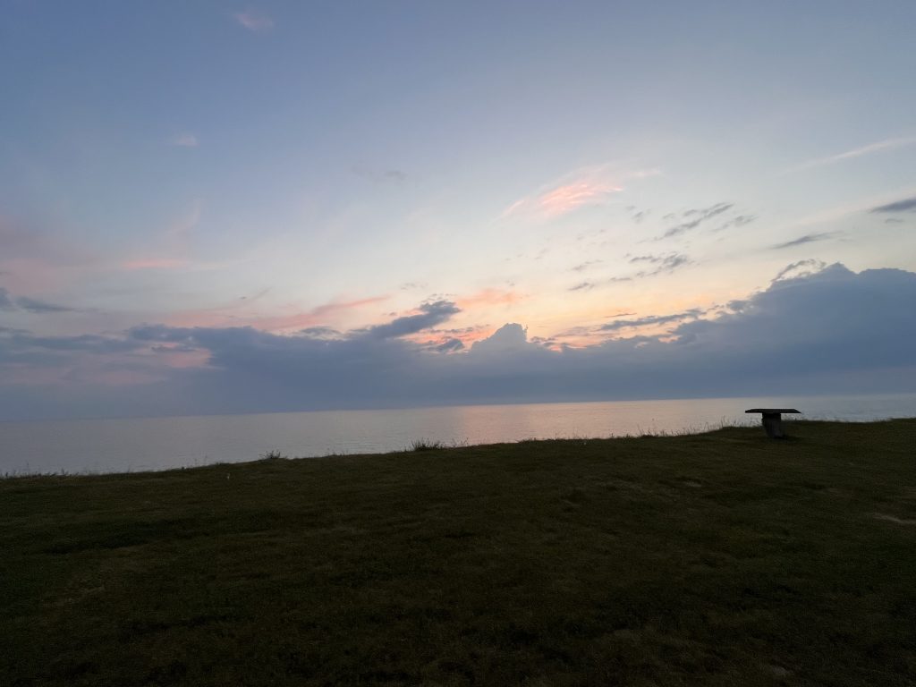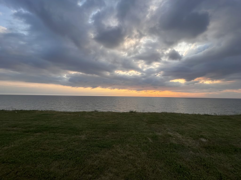 Bei einem Schild, welches auf einen Campingplatz hinweist, bogen wir dann kurz entschlossen ab und trafen auf dem Gelände nur einen Hund. Der bellte, bellte und bellt. Da wir uns nicht wagten auszusteigen, fuhr ich rückwärts die Einfahrt wieder hoch und Bogen zurück auf die Landstrasse ein. So fuhren wir weiter und waren uns nicht ganz sicher was wir jetzt noch machen. Denn es ist nach 21.30 Uhr und so ist auch sicher keine Rezeption mehr offen. Zufällig sahen wir einen Camper auf einem Kleien Parkplatz an der Klippe stehen, sodass wir einen wunderbaren Platz für die Nacht fanden. Wir stellten Knuschel ab und machten uns zu Fuss auf dem Weg an die Steilküste. Denn wir waren nur noch knappe 150 m von Meer entfernt.