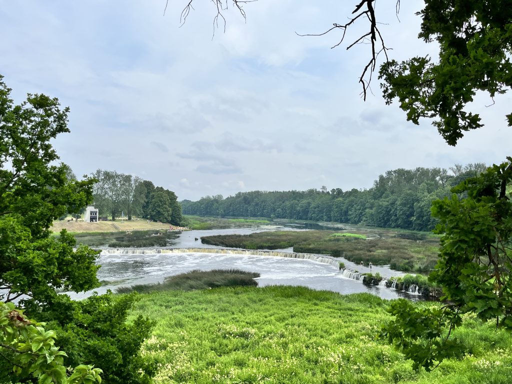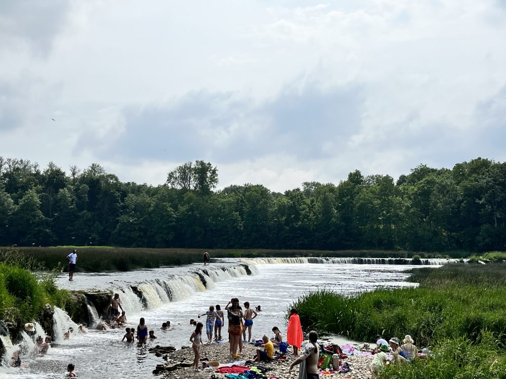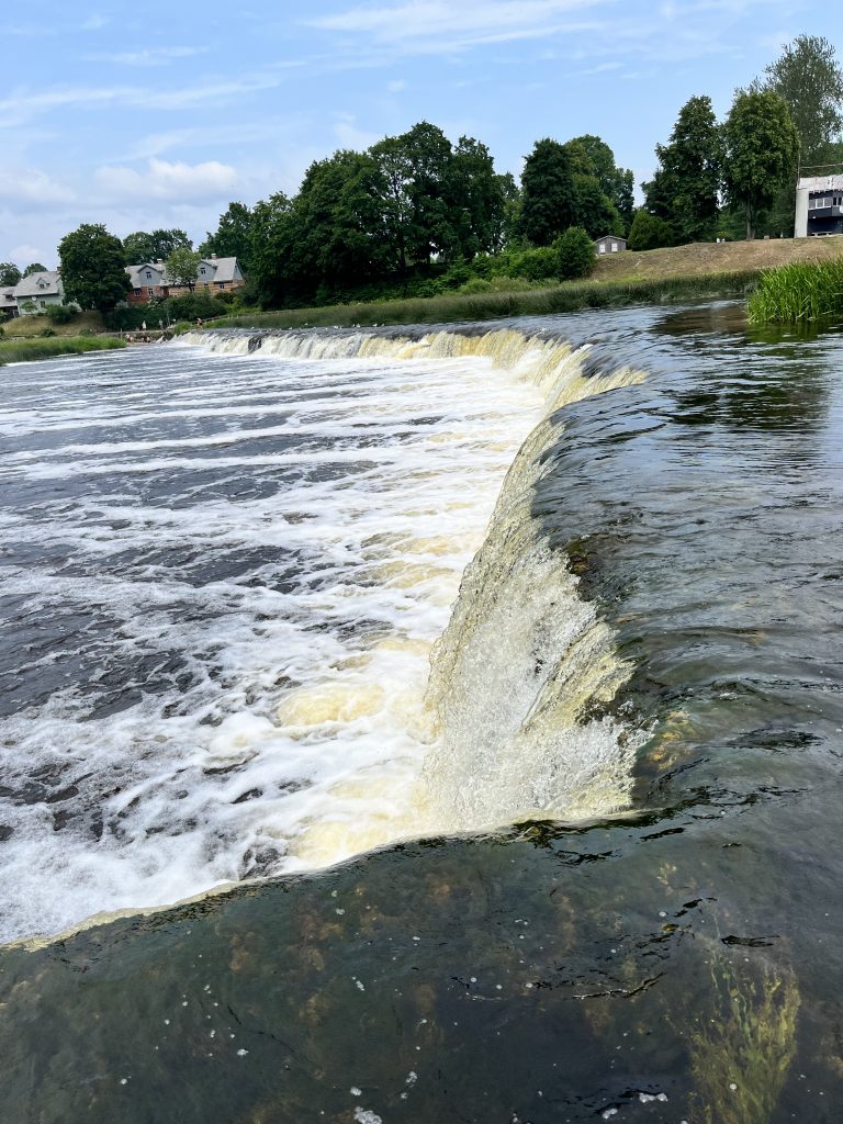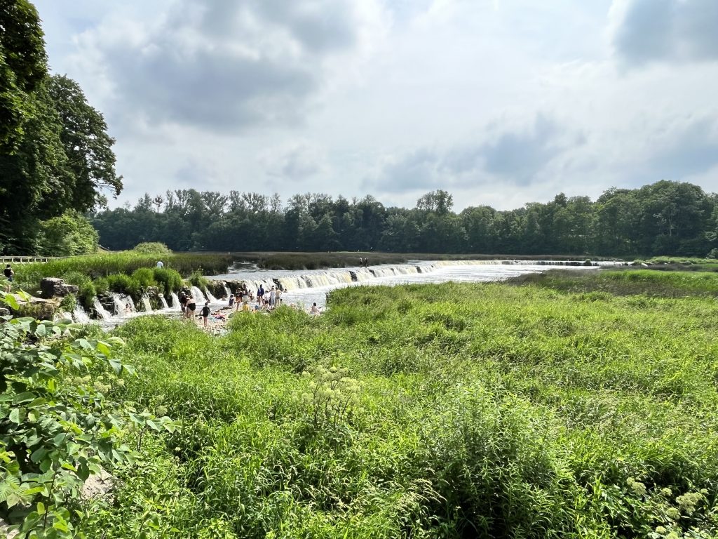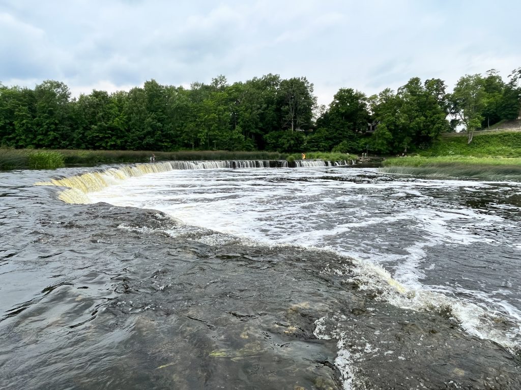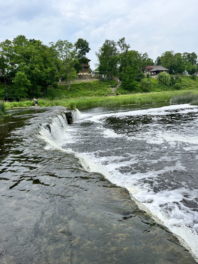 Kurze Zeit später erreichten wir wohlbehalten unser Ziel. Etwas desillusioniert machten wir uns auf den Weg zum Wasserfall. Denn er ist höchstens 70 cm hoch vielleicht 1 m an der tiefsten Stelle und sieht auf Fotos sehr viel eindrücklicher aus. Aber er ist breit. Wir beschlossen dann den Wasserfall zu überqueren, wie das viele andere auch machten. So kommt es, dass ich mit Kleidern baden ging. Denn ich bin auf den glitschigen Steinen ausgerutscht und ins Wasser geplumst. Da ich sowieso schon nass war, konnten wir auch gleich baden gehen. Nach einem Bad mit Kleidern machten wir uns auf den Weg nach Riga.