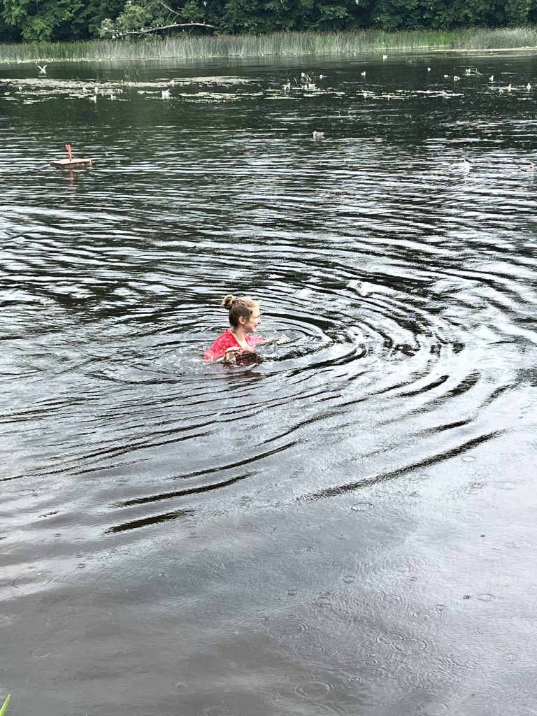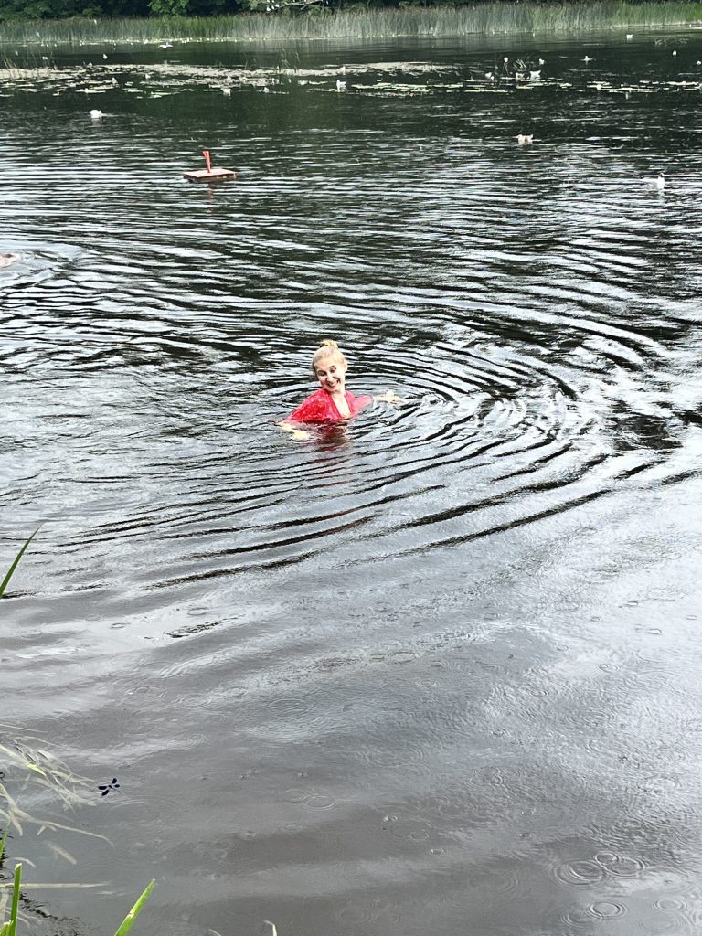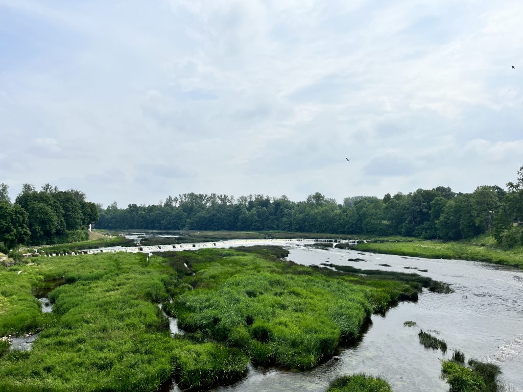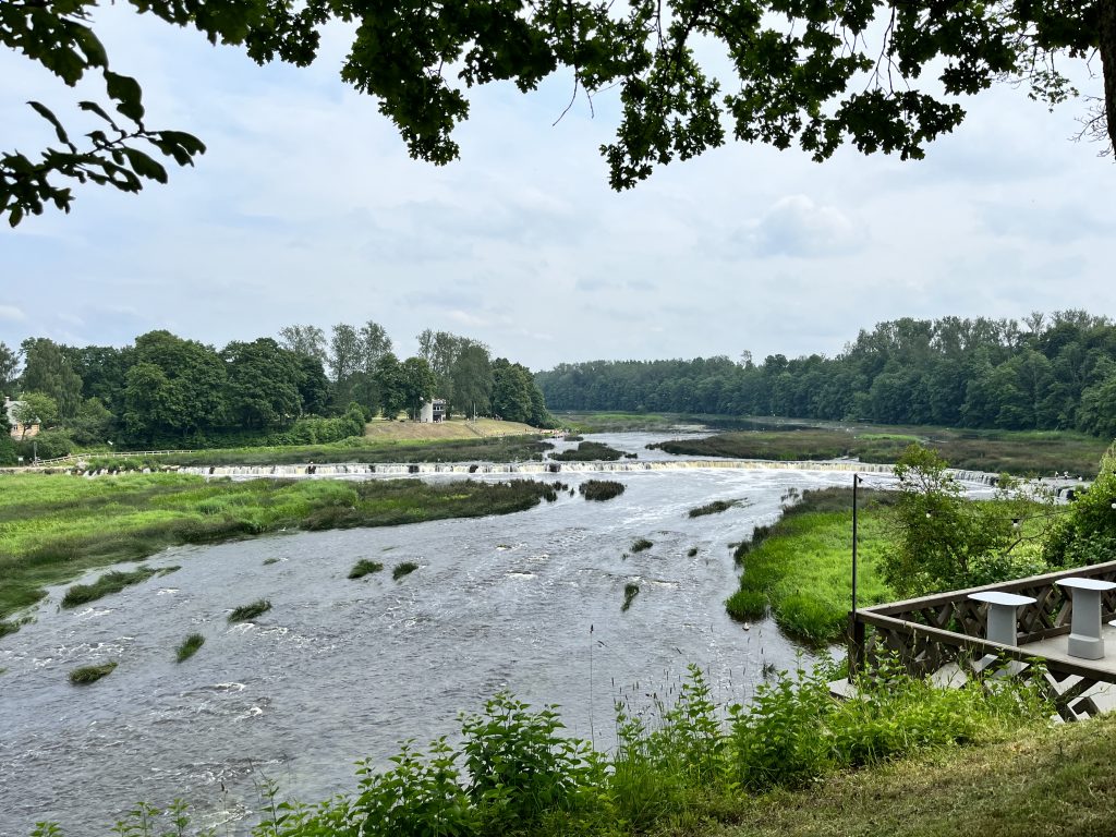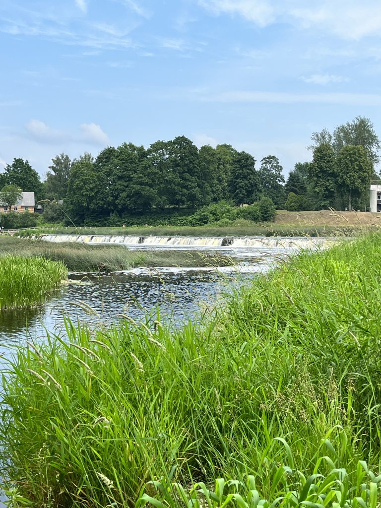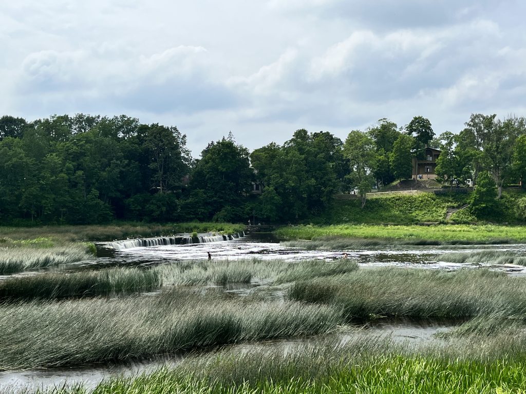 Kurze Zeit später erreichten wir wohlbehalten unser Ziel. Etwas desillusioniert machten wir uns auf den Weg zum Wasserfall. Denn er ist höchstens 70 cm hoch vielleicht 1 m an der tiefsten Stelle und sieht auf Fotos sehr viel eindrücklicher aus. Aber er ist breit. Wir beschlossen dann den Wasserfall zu überqueren, wie das viele andere auch machten. So kommt es, dass ich mit Kleidern baden ging. Denn ich bin auf den glitschigen Steinen ausgerutscht und ins Wasser geplumst. Da ich sowieso schon nass war, konnten wir auch gleich baden gehen. Nach einem Bad mit Kleidern machten wir uns auf den Weg nach Riga.