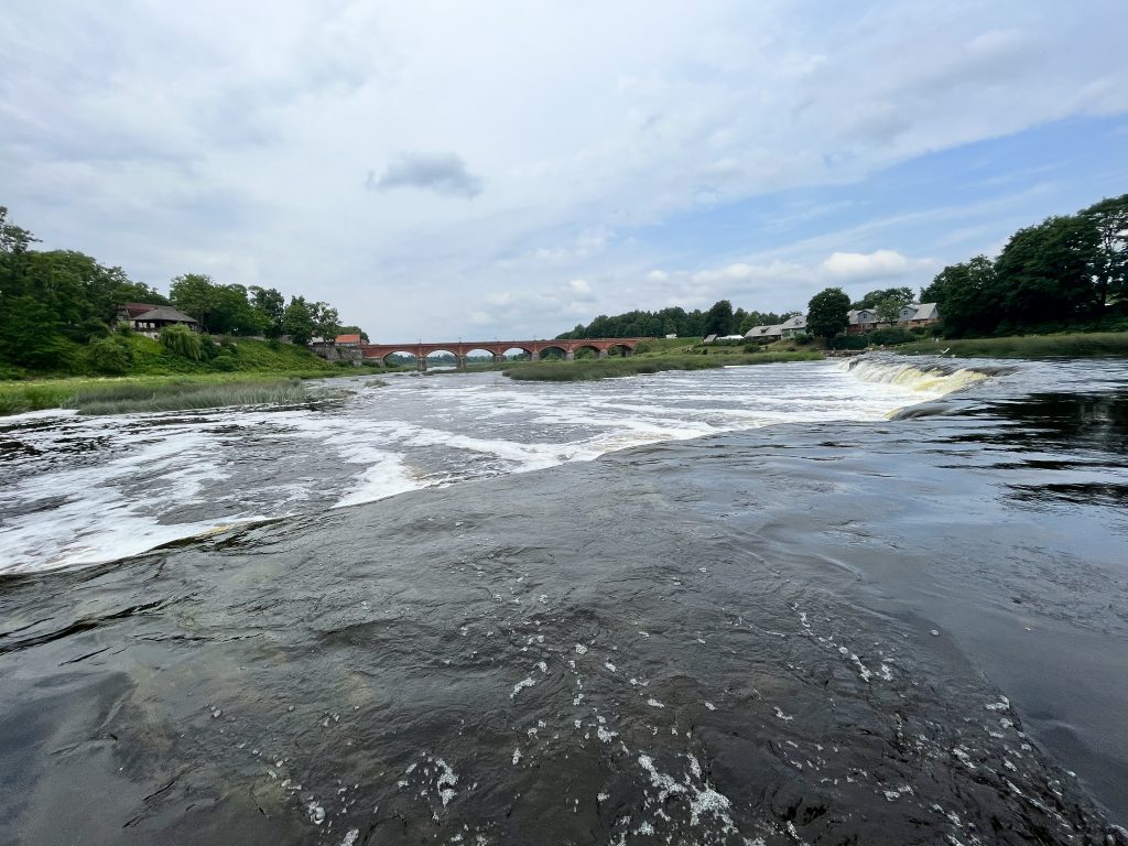 Nach unserem gemütlichen Frühstück machten wir uns auf den Weg zum Ventas Rumba. Das ist der breiteste Wasserfall Europas. Im Dorf angekommen, fanden wir uns vor diverse Umleitungen wieder, da sie eine Baustelle hatte. Irgendwie, fragt mich nicht wie, befanden wir uns plötzlich inklusive Knuschel in der Begegnungszone. Aus der Strasse, von der wir kamen, konnte ich nicht mehr zurück, denn es war eine Einbahnstrasse. Bei jeglichen anderen Strassen fand sich ein kein Einfahrtschild. Tja. Und so kommt es, dass ich Knuschel über ein Trottoir zurück auf die Strasse lenkte.
