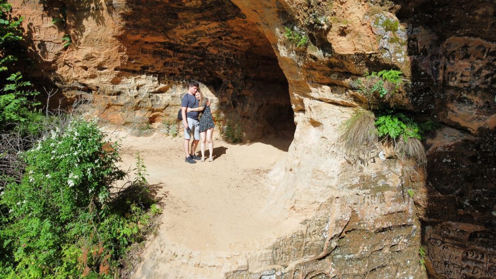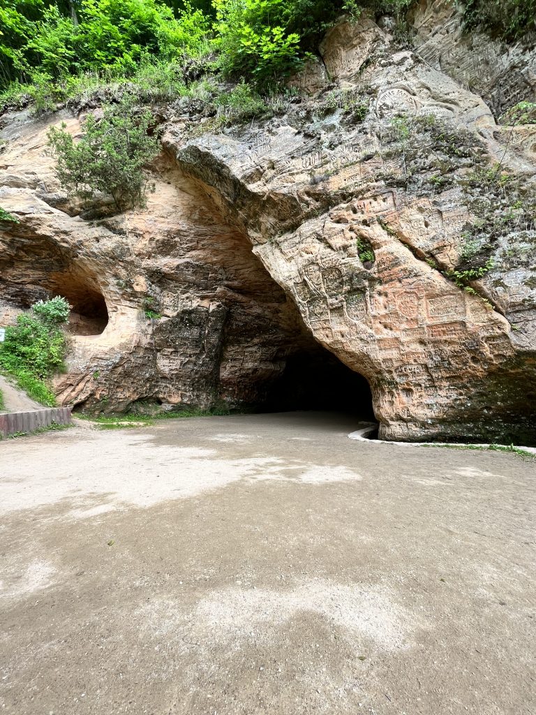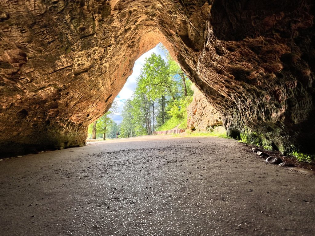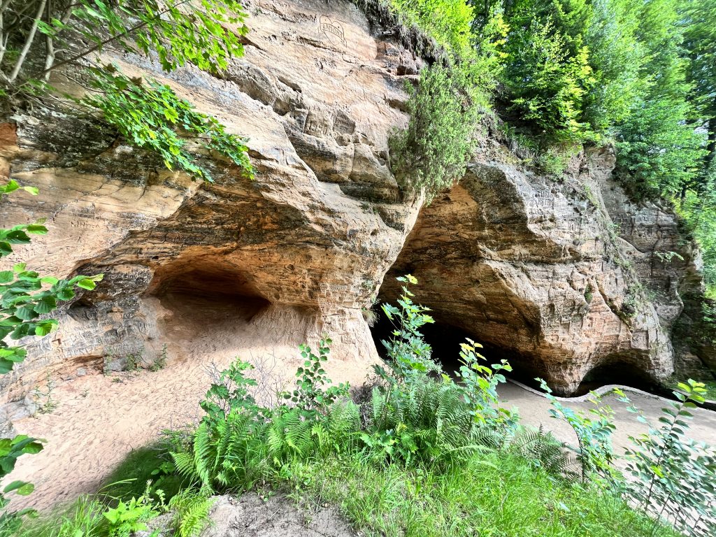 Da wir mit unserer Handwaschmaschine keine Badetücher und Bettwäsche waschen können, steuern wir noch einen Waschsalon an, kaufen Lebensmittel ein und fahren dann weiter zur Gūtmaņa ala Höhle. Sie ist die grösste Höhle Lettlands mit 18m Tiefe und 10m Höhe und 11m Breite. Die Legende der Rose von Turaida handelt in dieser Höhle und die Quelle welche hier an die Oberfläche tritt soll heilende Kräfte haben und in der Ehe ewige Treue und Liebe bringen. So kommen seit mehr als 200 Jahre Liebespaare zur Höhle und ritzen ihre Namen in den Sandstein.