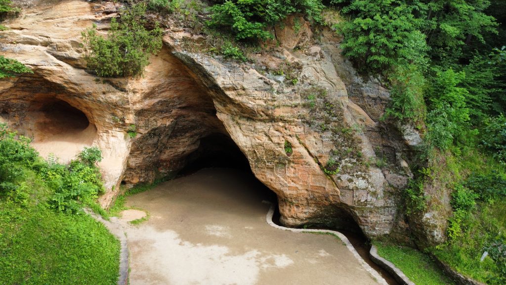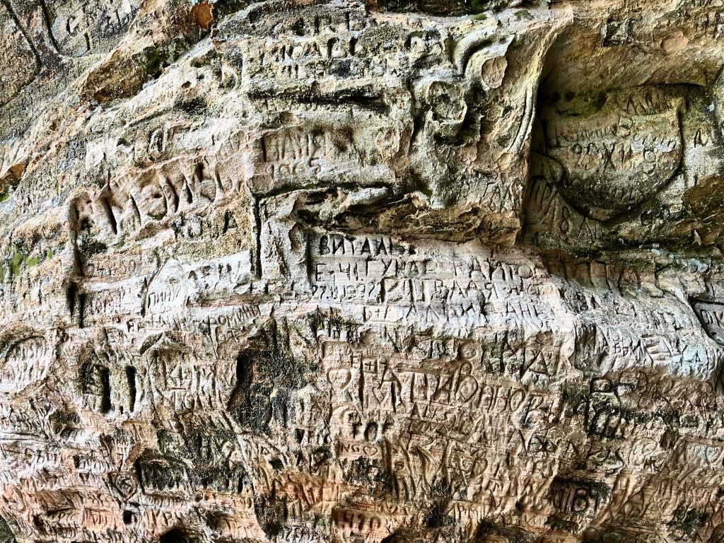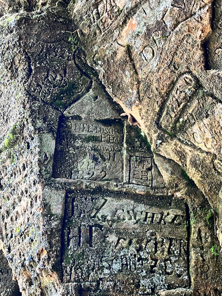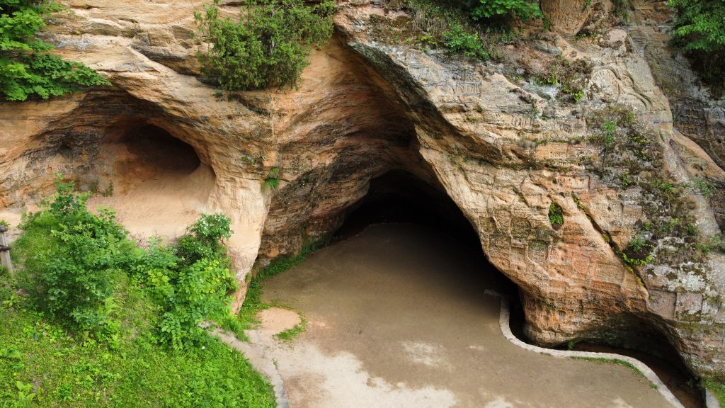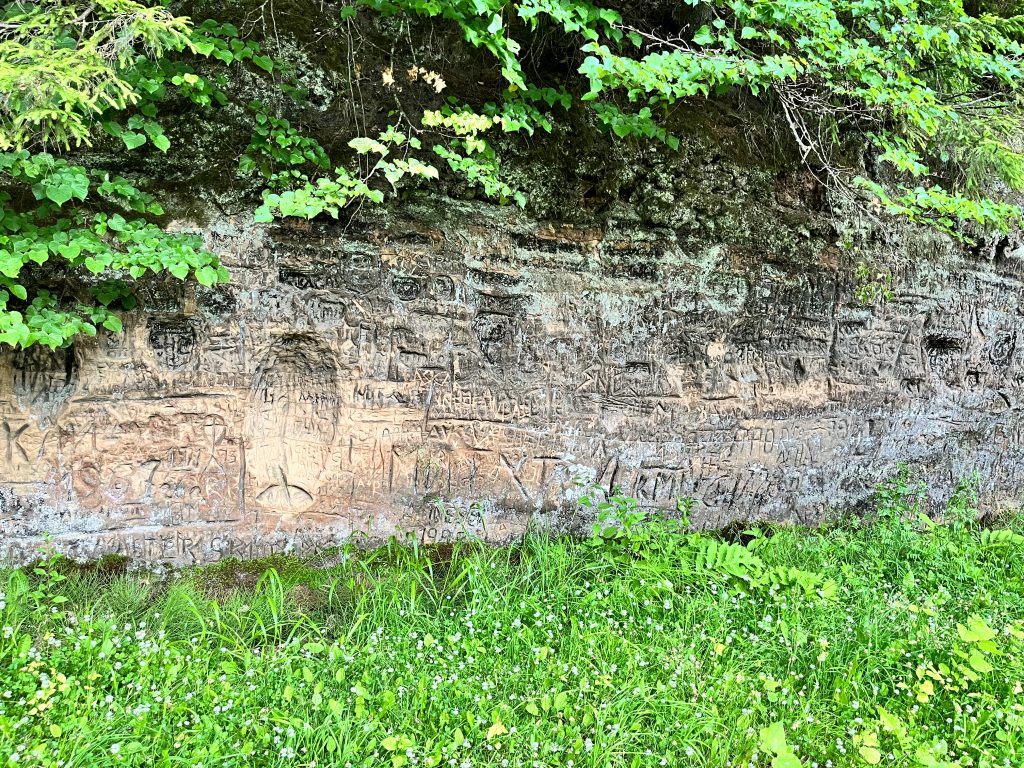 Da wir mit unserer Handwaschmaschine keine Badetücher und Bettwäsche waschen können, steuern wir noch einen Waschsalon an, kaufen Lebensmittel ein und fahren dann weiter zur Gūtmaņa ala Höhle. Sie ist die grösste Höhle Lettlands mit 18m Tiefe und 10m Höhe und 11m Breite. Die Legende der Rose von Turaida handelt in dieser Höhle und die Quelle welche hier an die Oberfläche tritt soll heilende Kräfte haben und in der Ehe ewige Treue und Liebe bringen. So kommen seit mehr als 200 Jahre Liebespaare zur Höhle und ritzen ihre Namen in den Sandstein.